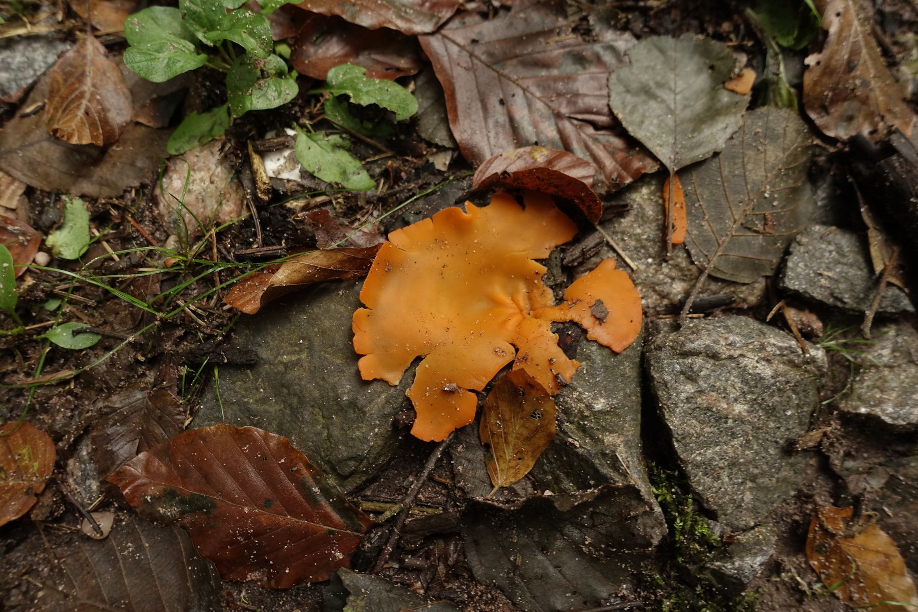 Ich habe ihn nicht entnommen und nur dies eine Foto. Liege ich richtig mit dem Orangebecherling Aleuria aurantia?