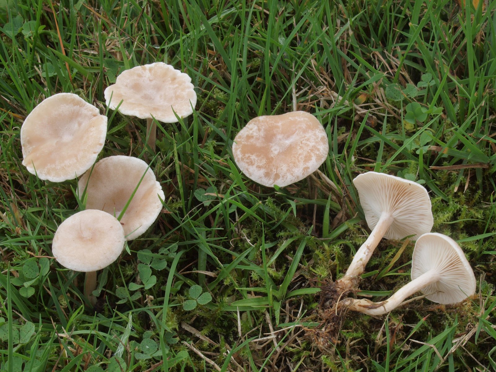 Weiße Wiesenellerlinge (Cuphophyllus virgineus) und Gebrechliche Saftlinge (Hygrocybe ceracea)