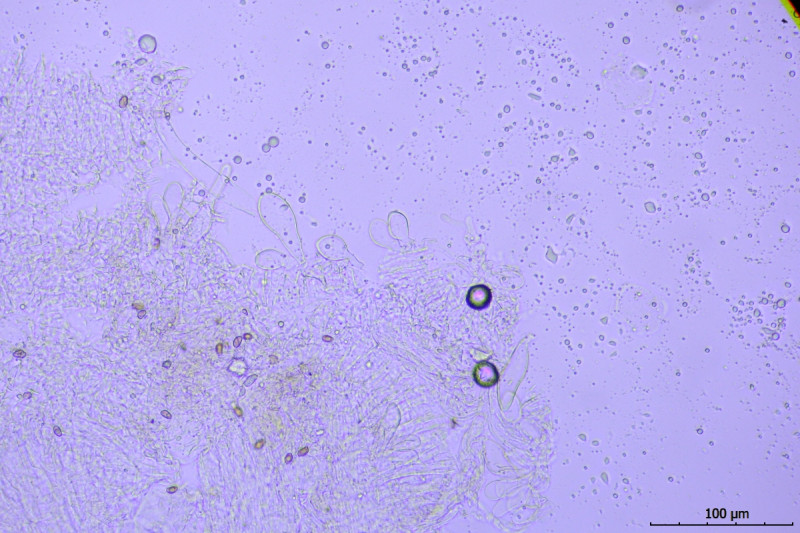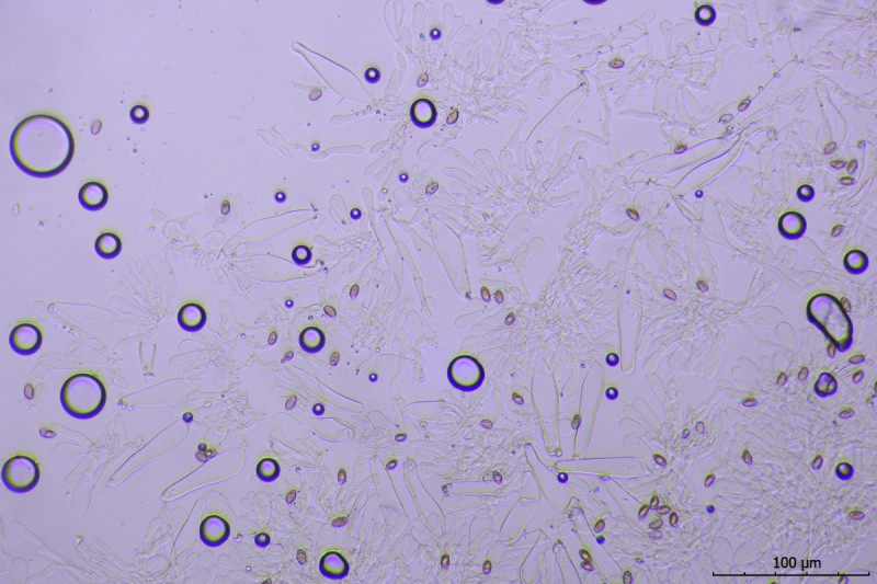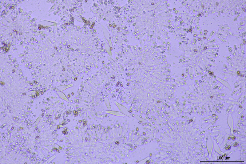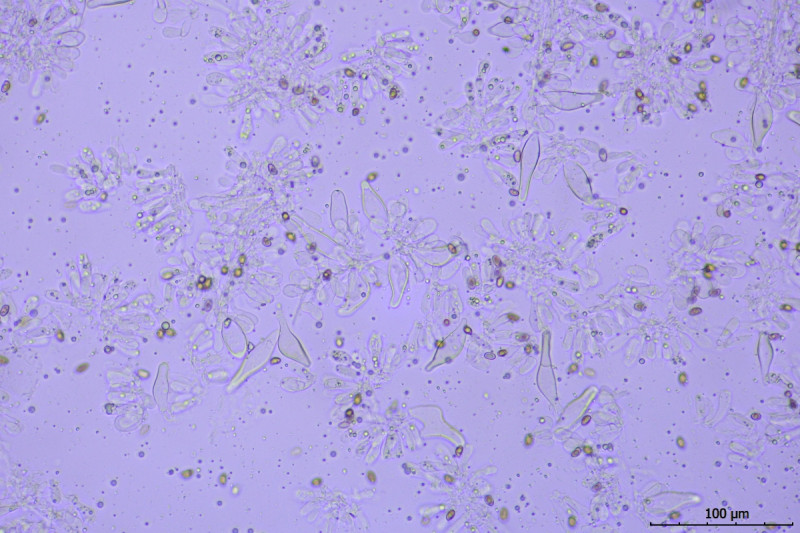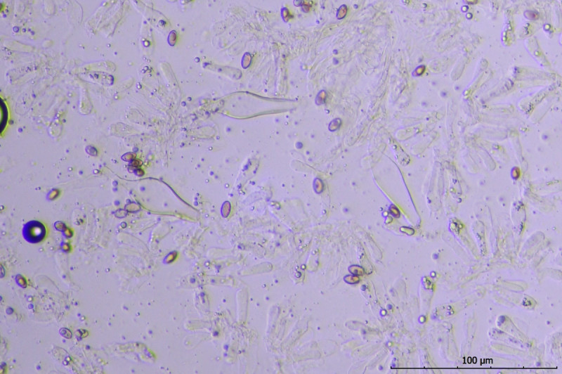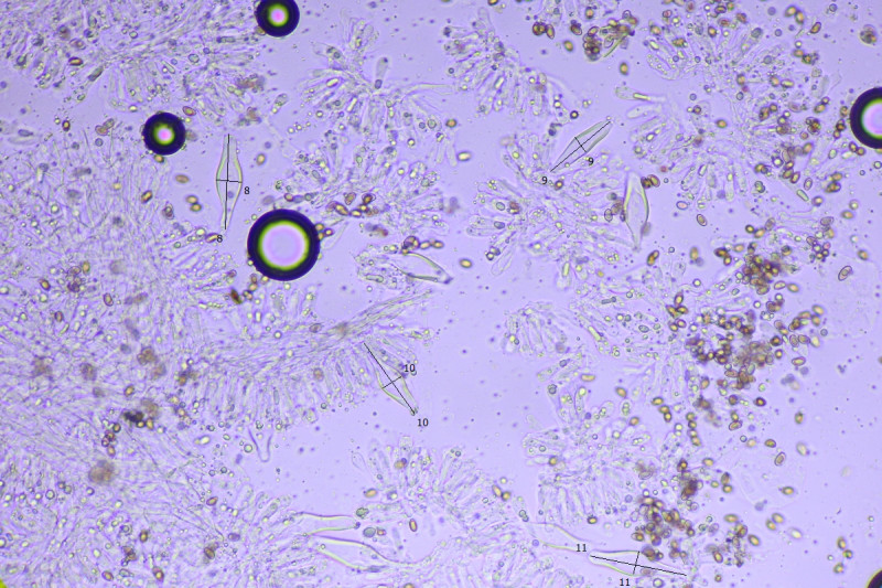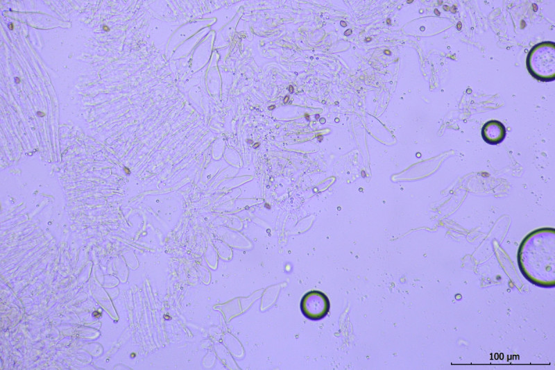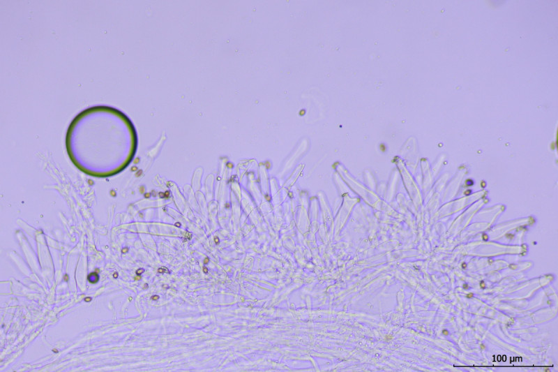 Larix, Quercus, Fagus. Boden potentiell basisch am Wegrand (keine Bodenprobe genommen, aber es wurden kalkliebende Arten an anderer Stelle am Wegrand gefunden). Wenige Caulozystiden gegabelt und hyphoide Elemente