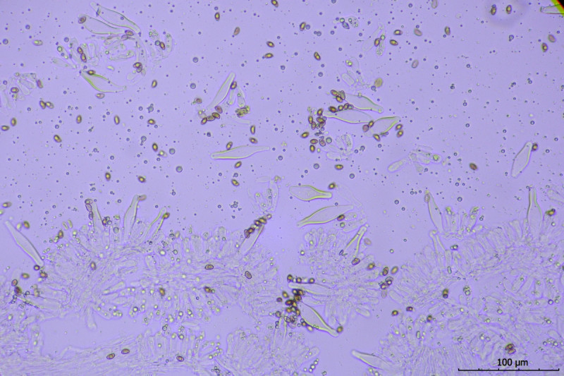 Quercus, Fagus (Acer?, Larix?(weit entfernt)), Boden potentiell basisch am Wegrand. Hutmitte braun und schuppig. Caulos in der Stielspitze, eine gabelnde Caulozystide gefunden, verschieden geformt und Übergänge zu den Parazystiden. Cheilos auch verschieden geformt