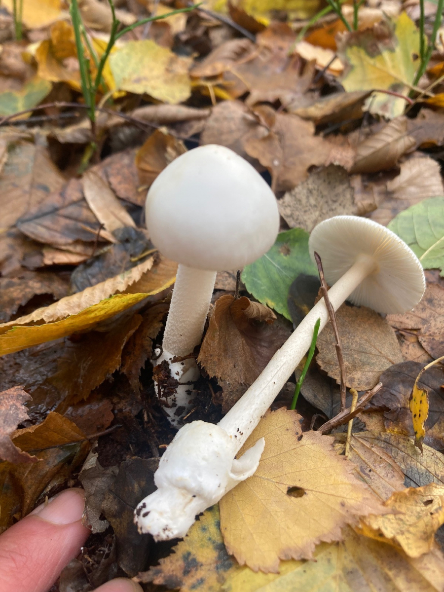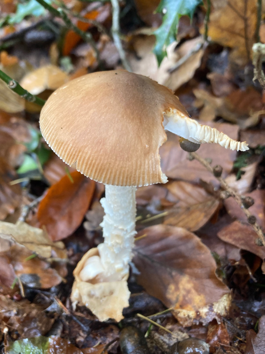 3. Den fand ich heute am Spannendsten. Ein Scheidenstreifling, wenngleich die Streifen auf dem Hut nicht gut sichtbar sind auf dem Foto. Er war weiß. Ich hab mal im Forum gestöbert und halte amanita vaginata var. alba für nicht die schlechteste Möglichkeit. Was meint ihr? Ich hab durch andere Beiträge im Forum schon mitbekommen, dass die Scheidenstreiflinge schwierig zu bestimmen sind …
