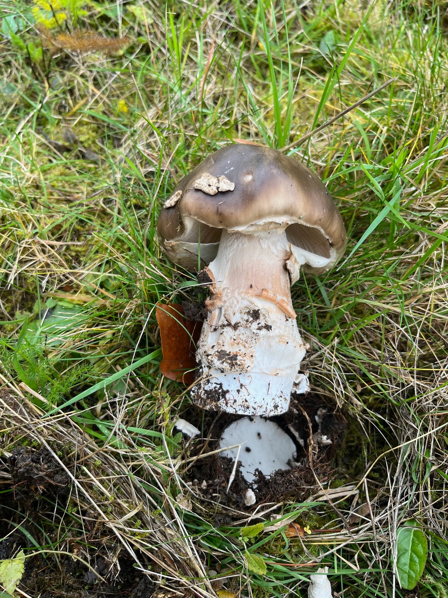 7. Ein seltsames Chamäleon von einem großen Pilz. Er fühlte sich hart an wie ein Steinpilz und war viel fester und kompakter als üblicherweise Amanita excelsa oder rubescens, wahrscheinlich hat er einen Frostschaden, vielleicht ist er rötend am Stiel ich bin mir aber nicht sicher ob das nur ein Fehler der Kamera war. Die Stielbasis war fest mit dem Boden verschweißt, daher kann ich zur Knollenform nichts sagen. Der Pilz ist mir abgebrochen. Ich hätte wohl einen Spaten gebraucht um die Stielbasis herauszubuddeln. Die Manschette hatte nur eine schwache Riefung, die Lamellen schienen weniger dicht zu stehen als bei Perlpilz &Co.