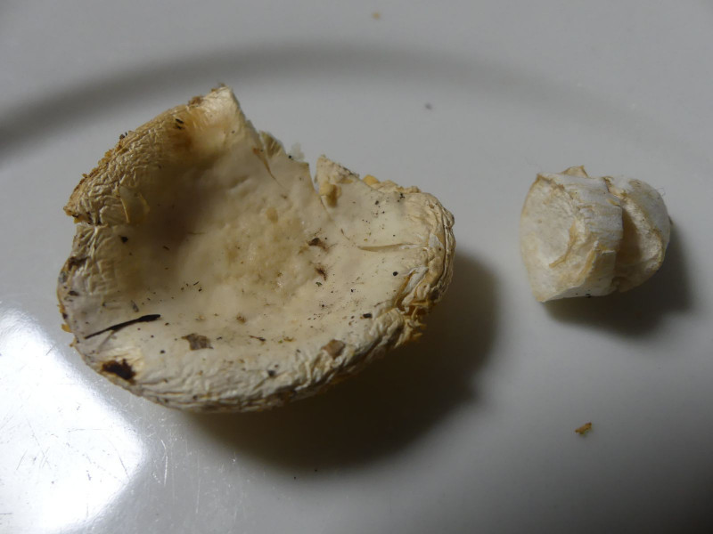 Ein eigenartiger Geruch, etwas feucht-rutschige Hutmitte (leicht trichterförmig), ockergelbe Lamellen, fast reinweiße Huthaut (leicht rahmgelblich in der Hutmitte) und ein völlig milder Geschmack sind die Merkmale dieses Fruchtkörpers. Über Nacht hatte ich ihn zum Aussporen liegen lassen - Fehlanzeige! Die Huthaut ist jetzt auch ockergelblich nach 30 Stunden offenem Herumliegen bei Raumtemperatur.