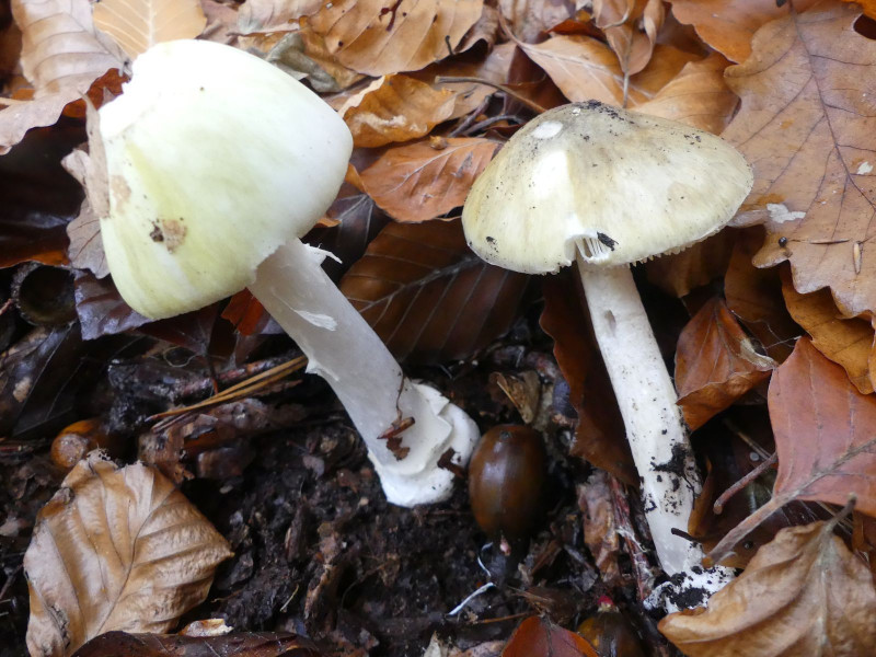 die Pilzsaison nähert sich langsam aber sicher dem Ende für dieses Jahr. Gleichwohl konnte ich heute noch ein paar schöne Funde einsacken, die ich präsentieren möchte. Dabei sind auch ein paar Arten, die sonst eher zu Beginn der Hauptsaison auftauchen, dieses Jahr aber erst sehr spät "in die Puschen" gekommen sind. Die Amaniten Grüner Knollenblätterpilz und Pantherpilz finde ich bei ausreichender Regenmenge regelmäßig schon im August. Dieses Jahr wollten die nicht, obwohl es für die Dickröhrlinge regentechnisch ausgereicht hat, denn da konnte ich Ende Juli und Anfang August reiche Ernte einfahren. Hier ein frisches Pärchen Grüne Knollenblätterpilze: