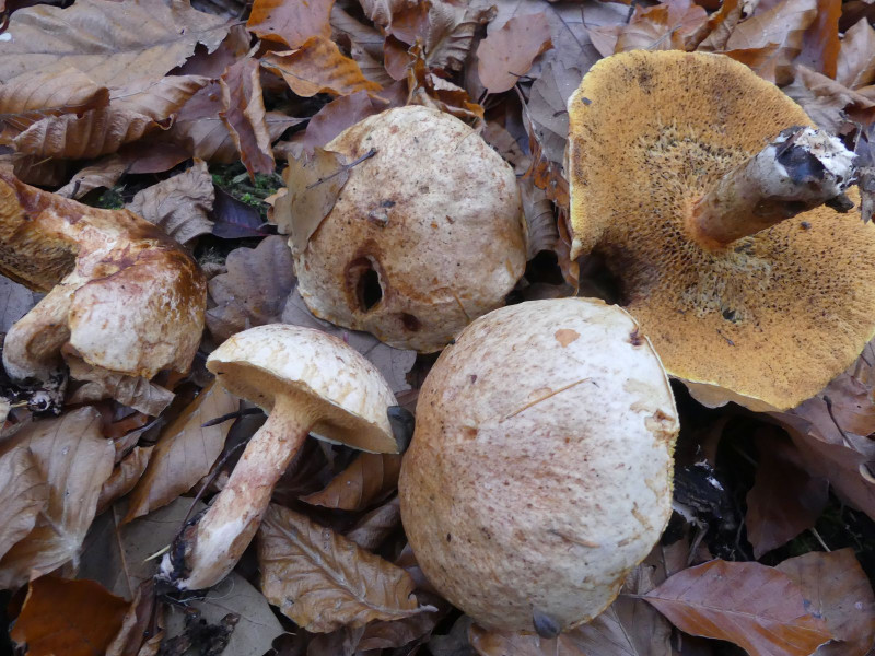 Etwas selteneres habe ich auch gefunden, nämlich Rostrote Lärchenröhrlinge Suillus tridentinus. Auf dem Foto kommen die schön orangefarbenen Röhrenmündungen leider nicht so gut rüber, es war schon später Nachmittag und eine dicke Wolkendecke sowie immer noch Laub an den Bäumen haben für schwierige Lichtverhältnisse gesorgt: