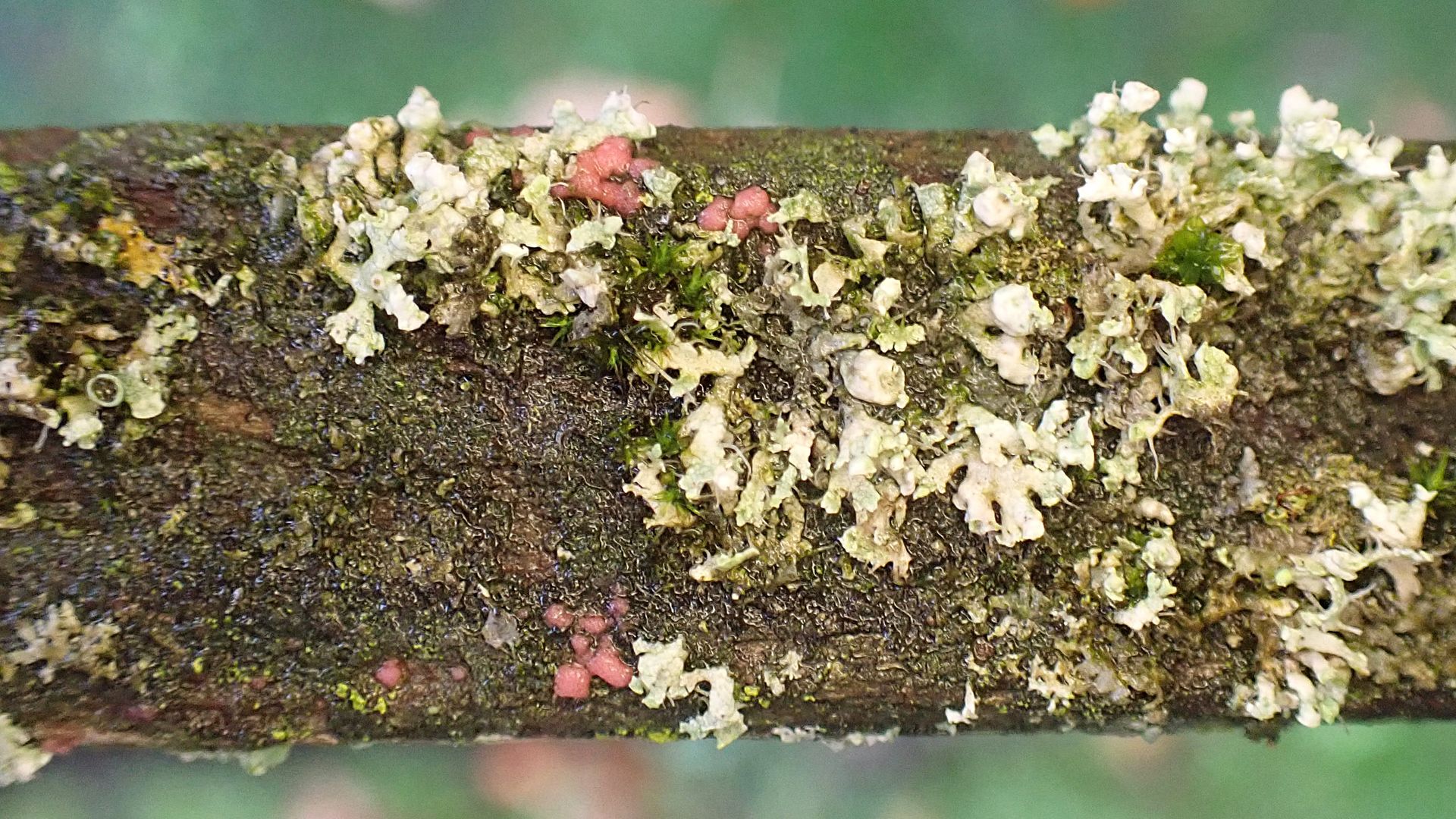 Heute morgen leuchtete mich dieser pinkfarbene Pilz so an, und da sollte ich doch eigentlich auch wissen, wie die Flechte drumrum heißt.
