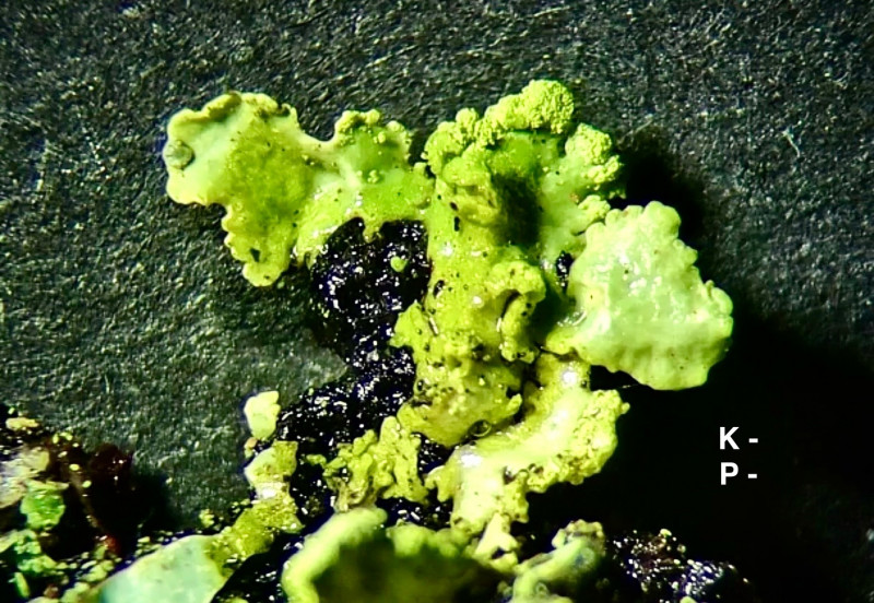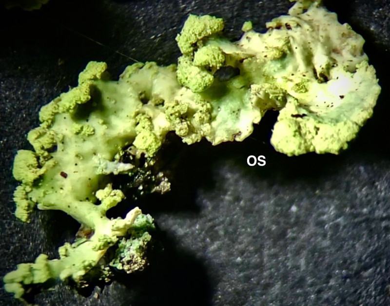 Die gelbe Blattflechte kommt im Bergland auf saurer Borke vor. Auffallend sind die gelben Bortensorale und das gelbe Mark.