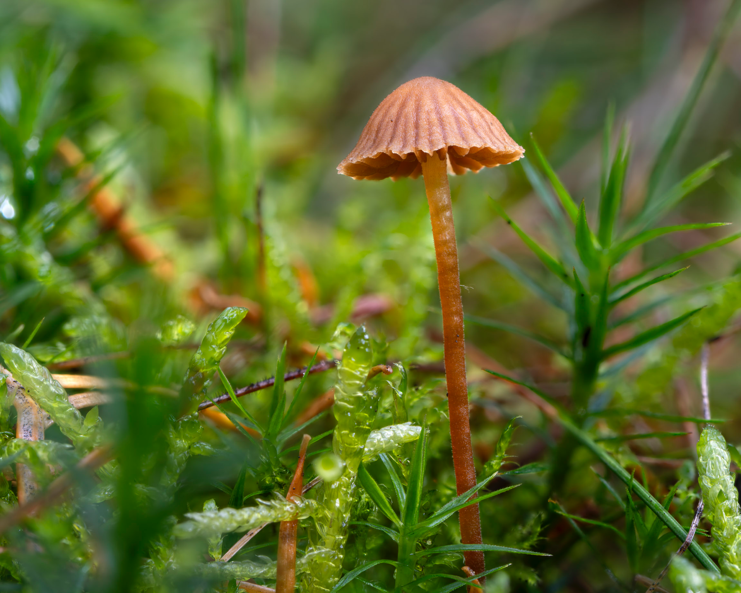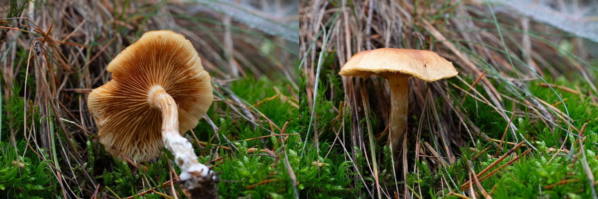Diesen hier konnte ich zumindest als Häubling identifizieren (Kappe etwa 1,5 cm, Höhe etwa 12-15 cm), es standen einige davon verteilt in einer Fläche von etwa 3-4 qm. Vermutlich sind es G. vittiformis oder G. hypnorum, aber das lässt sich wohl nur mikroskopisch klären (2):