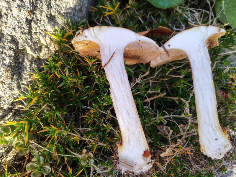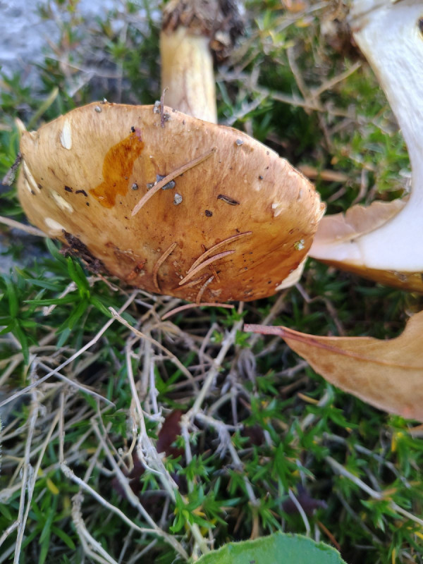 • Grüße in den Süden auf jeden Fall, und auch dort schöne Phlegmacienfunde. Die Knolle ist scharf gerandet, die Lamellen waren jung so beige/ockerbräunlich, die Farbe auf den Bildern ist recht farbecht. KOH überall negativ, am Hut recht hübsch orange aber das läuft noch unter negativ oder?