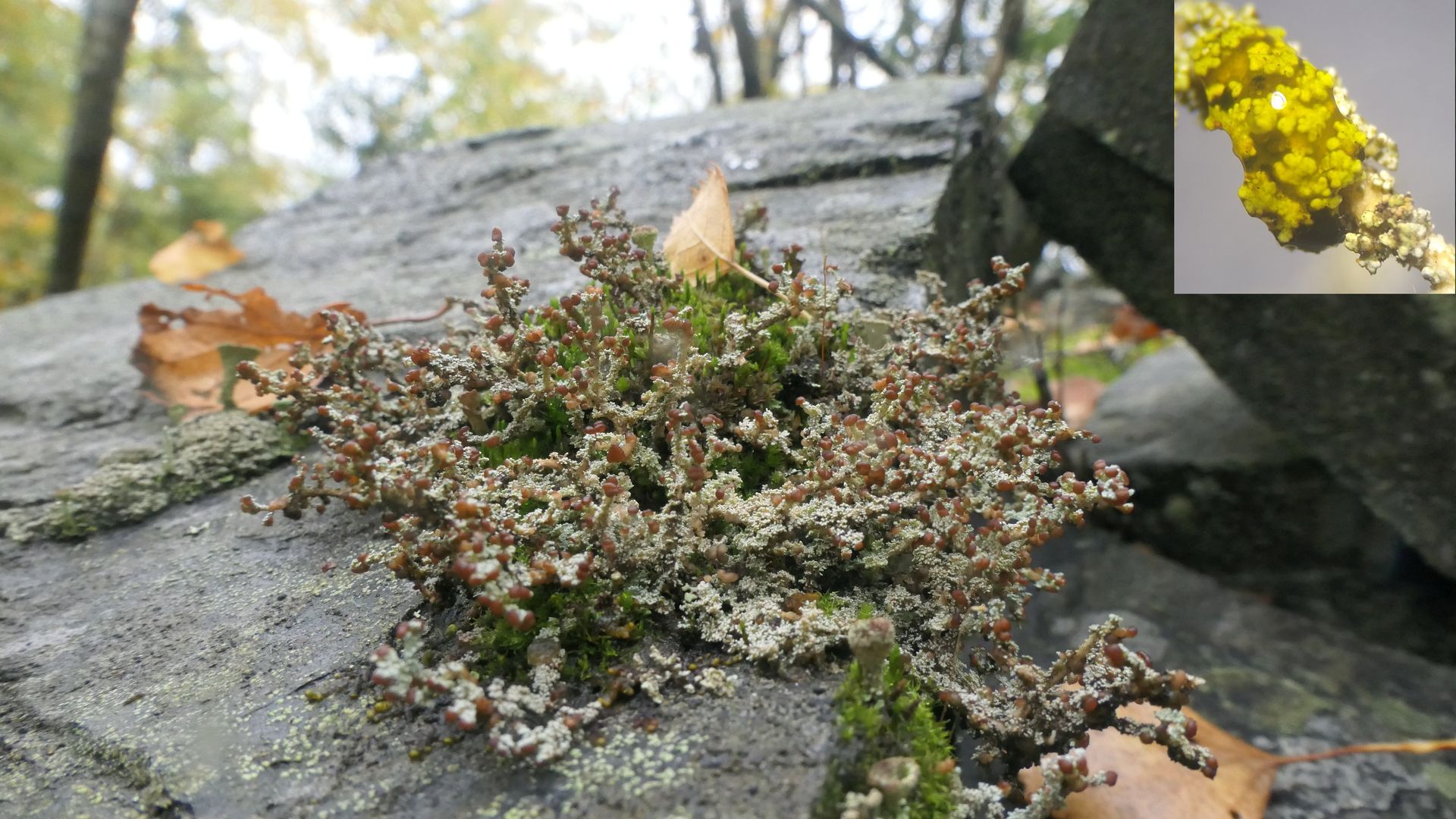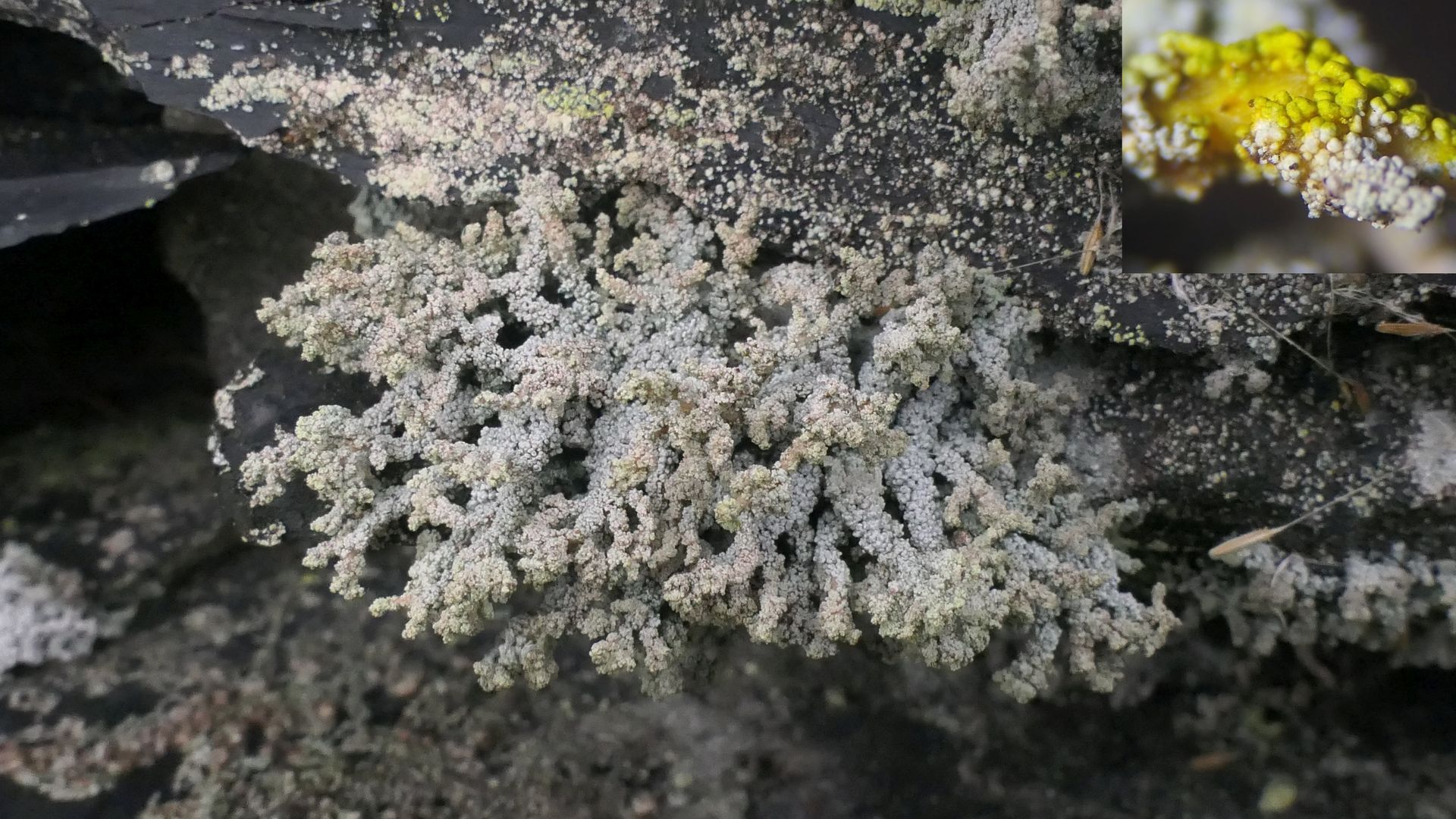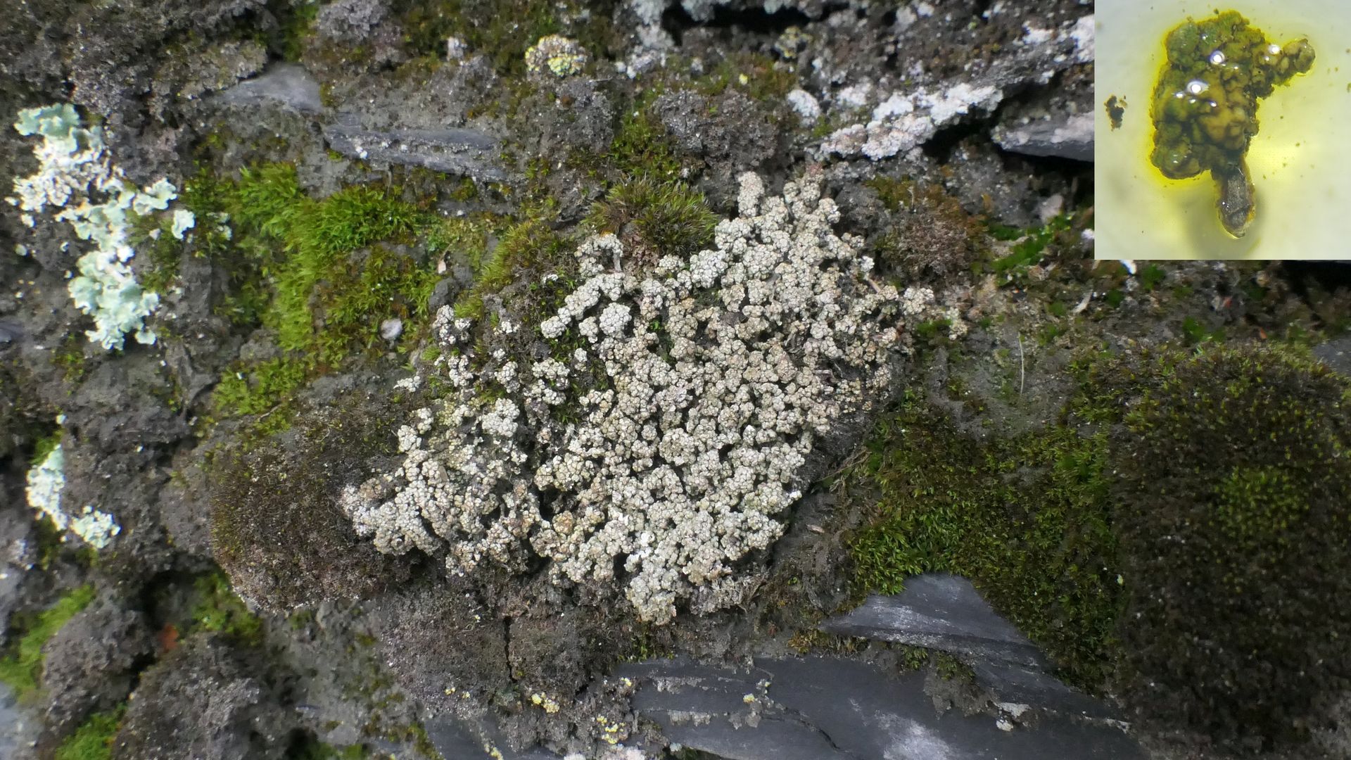 Stereocaulon vesuvianum (f. nodulosum): (meist) steril, Phyllocladien schildartig bis (hier) körnig, mit hellem Rand und dunklem Zentrum in größeren Phyllocladien; P+ kräftig gelb: