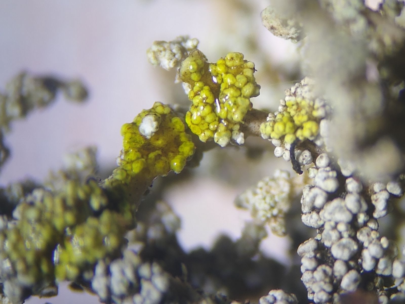 Bild B3 Die Probe reagiert nur P+ gelb, für mich keine Spur von Orange! Die Reaktion wird bei Italic für die Art als P+ gelb beschrieben. Vordergrund rechts im Bild größere Phyllocladien mit dunklem Zentrum.