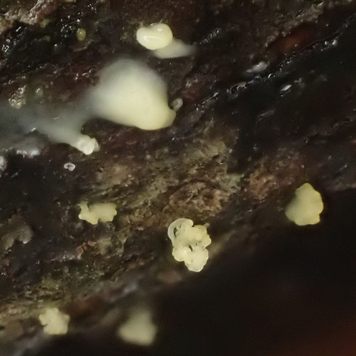 Winzig, gelblich, auf Rinde: Konidien