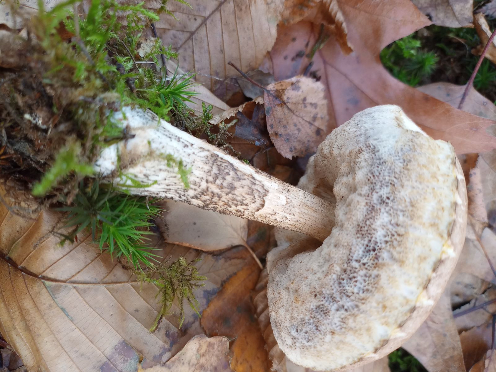 Ein Birkenpilz (Leccinum scabrum), der eine seltsame, helle, leicht rosa-fleckige Hutfarbe hatte (auf dem Bild nicht ersichtlich)