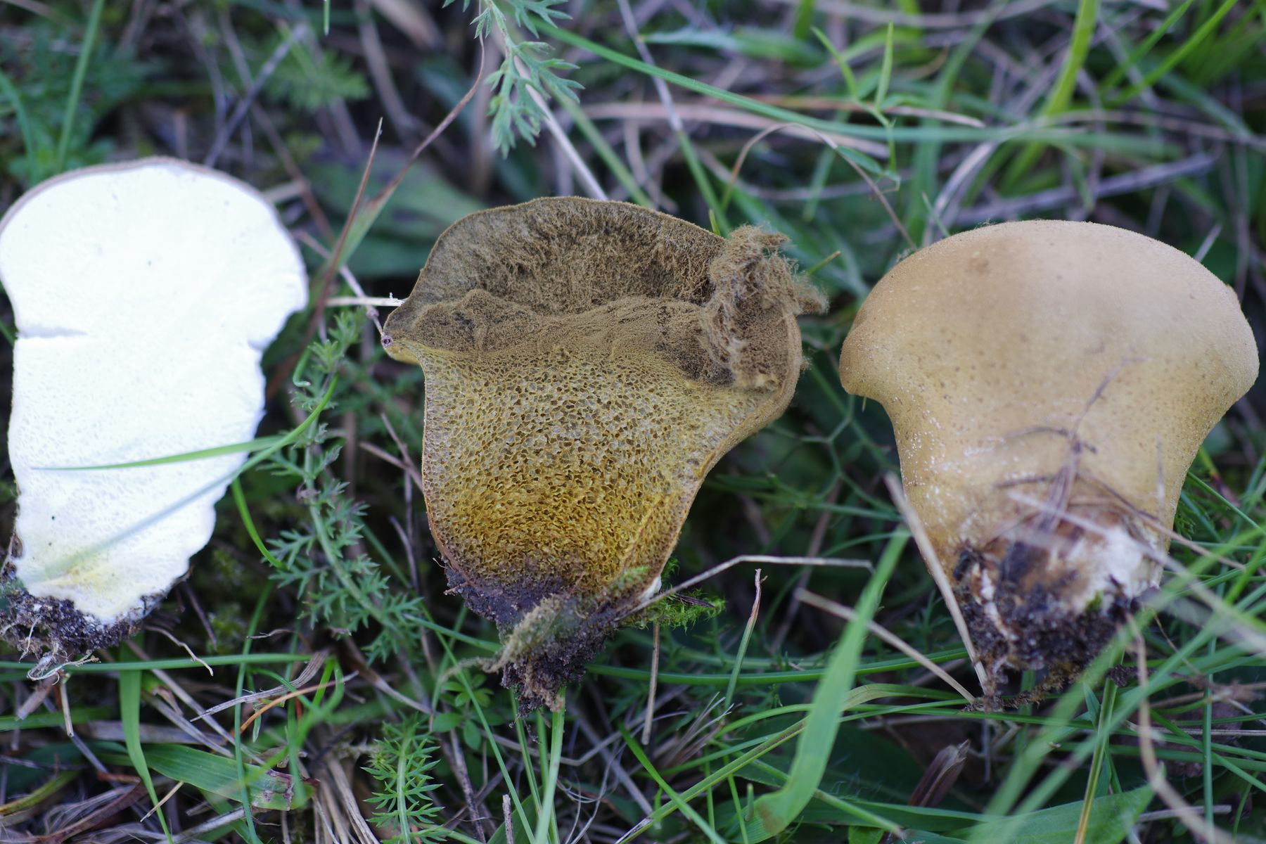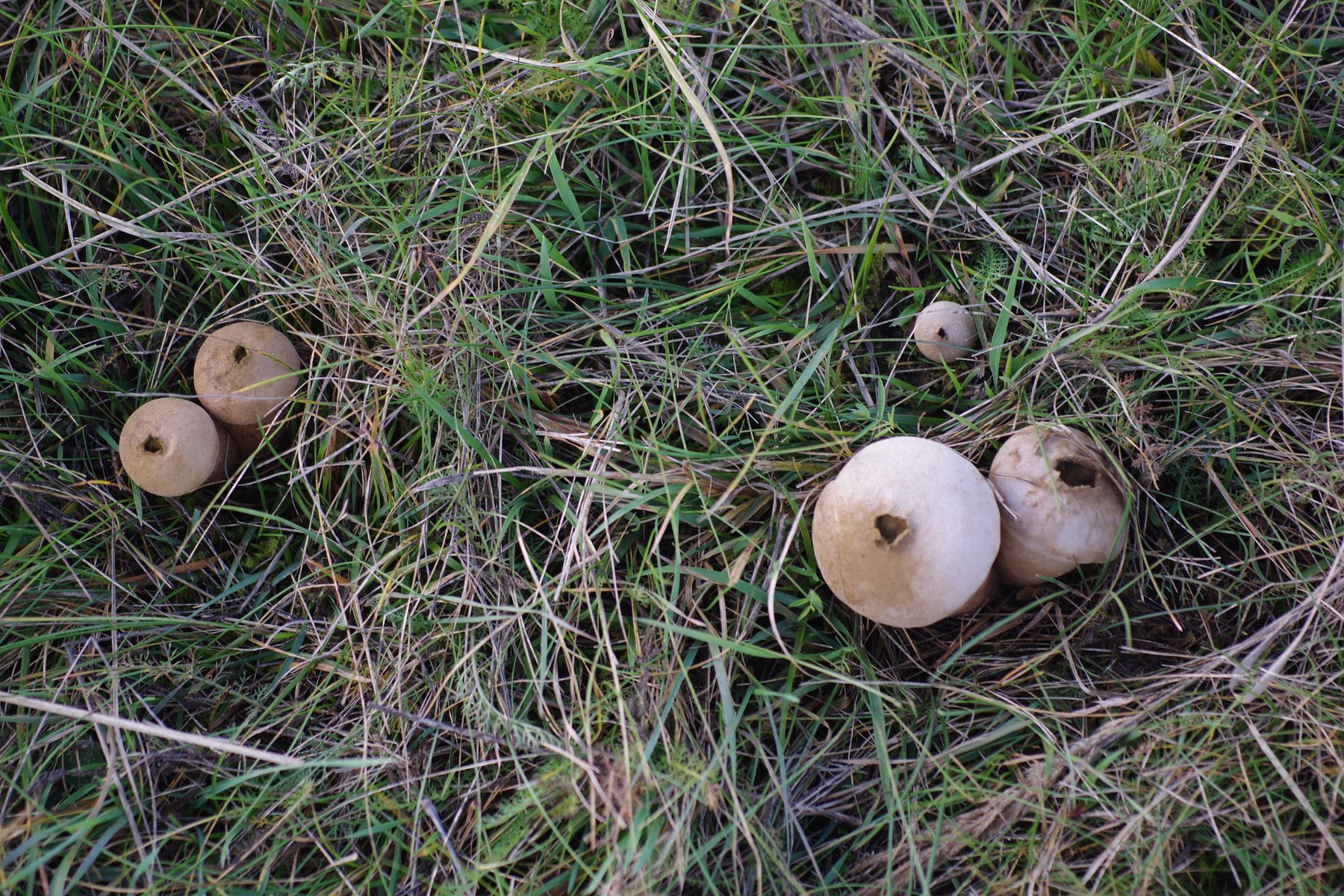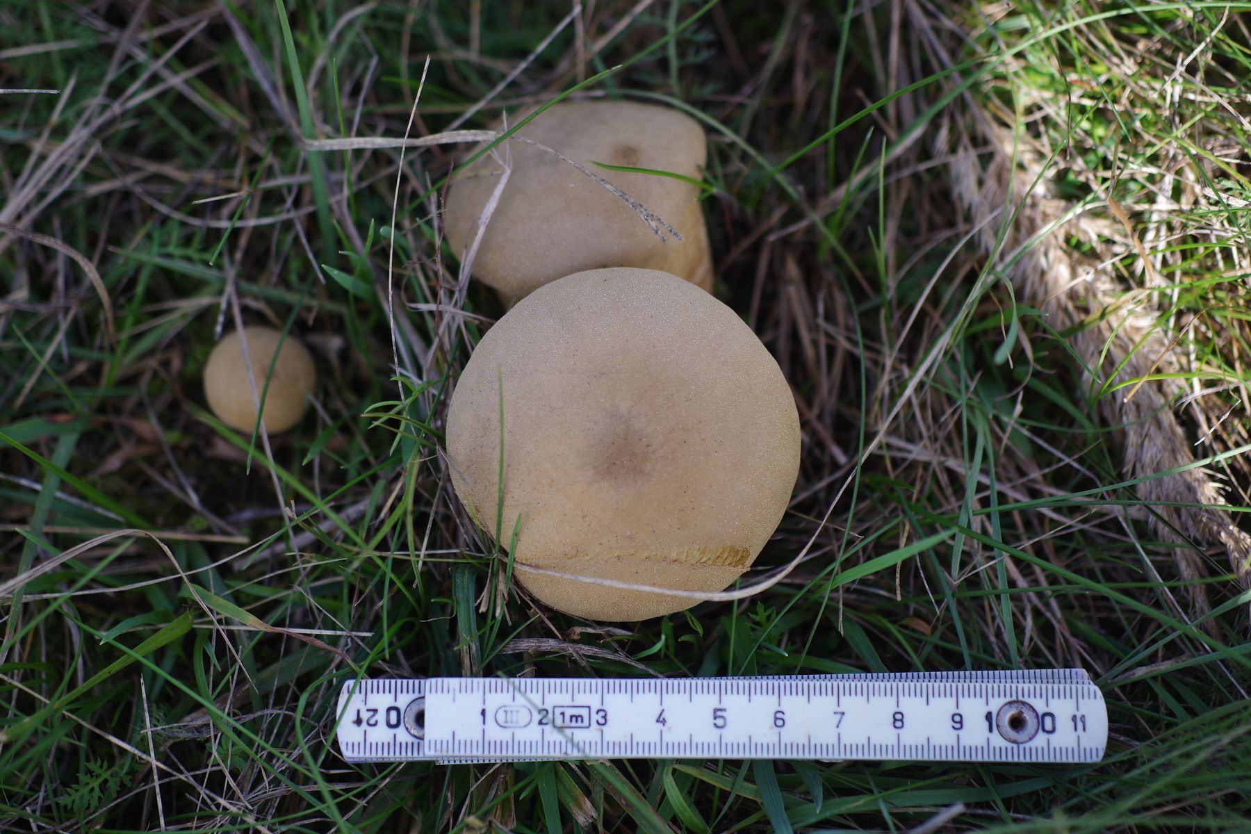 ich hab' einen nicht so arg häufigen Stäubling zu zeigen: Lycoperdon ericaeum Bonord. (1857), teils auch als Unterart in L. muscorum eingegliedert, bzw. jüngst auch in eine andere Gattung Leptocaulis ericaeus (Bonord.) R.L. Zhao & J.X. Li (2024) umkombiniert. Auf der Wiese, wo auch all das andere Zeug wächst. Komisch nur, dass es heißt, L. ericaeum solle auf saurem Boden wachsen, wohingegen weder die Pflanzenwelt, noch die anderen Pilze auf sauren Boden hinweisen. Eventuell eine Mikroanomalie, weil im Zuge der Trockenlegung, in der Wiese in den 80ern auch Rohre verbuddelt wurden und der Boden dann irgendwie wieder reingeschüttet wurde. Wobei aber die oberen Bodenschichten trotzdem alle kalkhaltig sind und Torf hat es hier noch nicht.