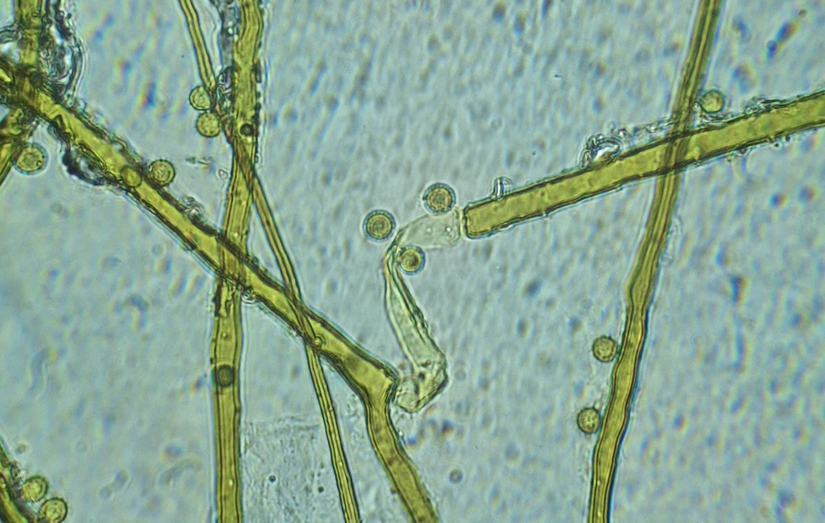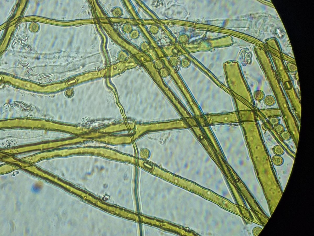Capillitium gelb bis gelbbraun, bis zu 9 µm breite Stränge, Septen vorhanden bzw. Bruchstellen an Septen, hier mal eine Septierung mit eingeschobenem stück Paracapillitium. Unseptierte Verzweigungen gibt es gelegentlich auch. Poren ungleichmäßig verteilt, stellenweise sehr häufig