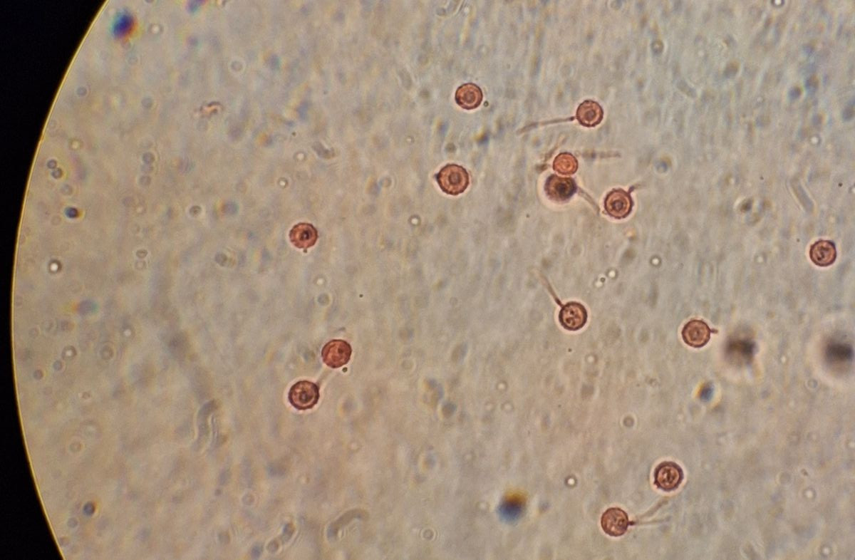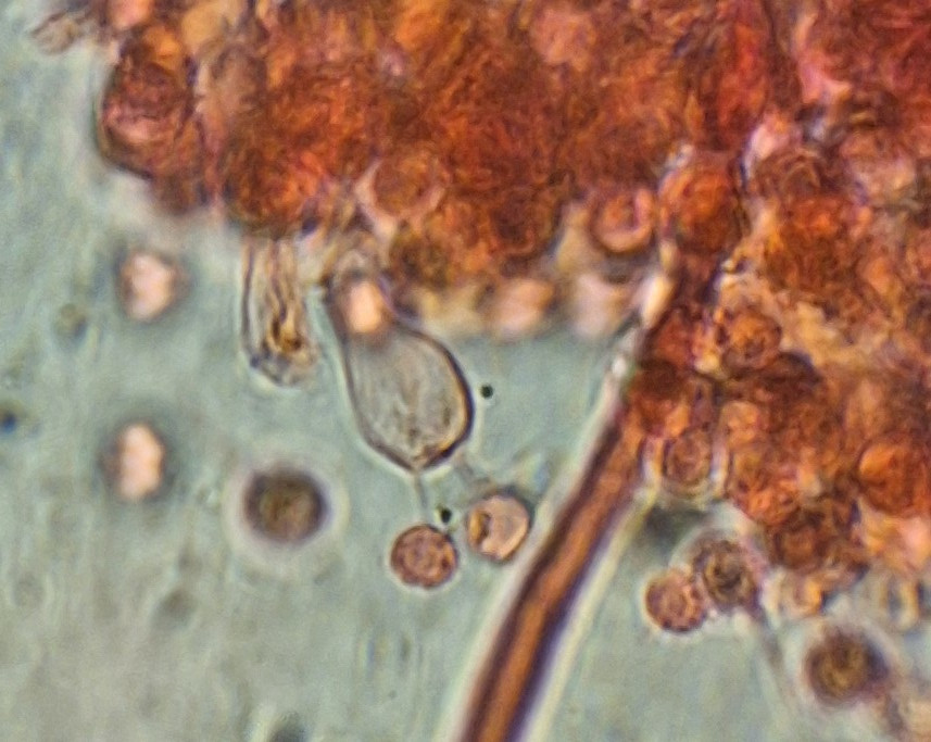 teilweise noch Basidien mit Sporen (das Zeitfenster dafür ist bei Stäublingen ziemlich kurz und mehr oder weniger auf frische Belege beschränkt), hier mit kurzen Sterigmen aufsitzend