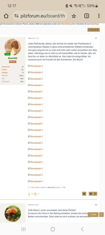 Hallo Stefan, ich spinne nicht, und ich kann's auch nicht ändern: Jedesmal, wenn ich den Thread hier wieder aufmache, sehe ich Baumis Panther-Bilder...und ich verfüge nur über ein sehr einfaches preiswertes Handy und keinerlei IT-Spezialwissen. Vllt liegt's gerade daran...oder ich hab's einfach drauf...🤷🏻♀️ Ich muß natürlich immer zuerst die Elfen von der Tastatur wischen und die Einhörner verjagen, wenn ich mal an einem Post für's Pilzforum arbeiten will! 🧚♀️🧚🏽🦄🦄