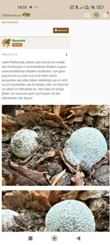 Liebe Pilzfreunde, dieses Jahr konnte ich wieder den Pantherpilz in verschiedenen Stadien in ganz unterschiedlichen Wäldern entdecken. Von ganz jung bis hin zu uralt und nicht mehr schön anzusehen war alles dabei. Allerdings war er nicht so oft anzutreffen, wie im letzten Jahr. Ich fand ihn vor allem im Altmühltal an. Hier habe ich einige Bilder. Ich wünsche euch viel Freude mit den Aufnahmen. Der Baumi