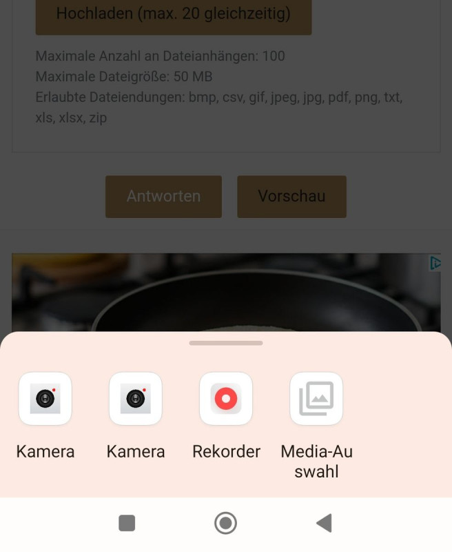 Dann erscheint irgendeine Auswahl, die dein Endgerät zur Verfügung stellt, wo du dann aus Fotos, Dateien etc aussuchen kannst. Bei meinem Handy sieht's so aus:
