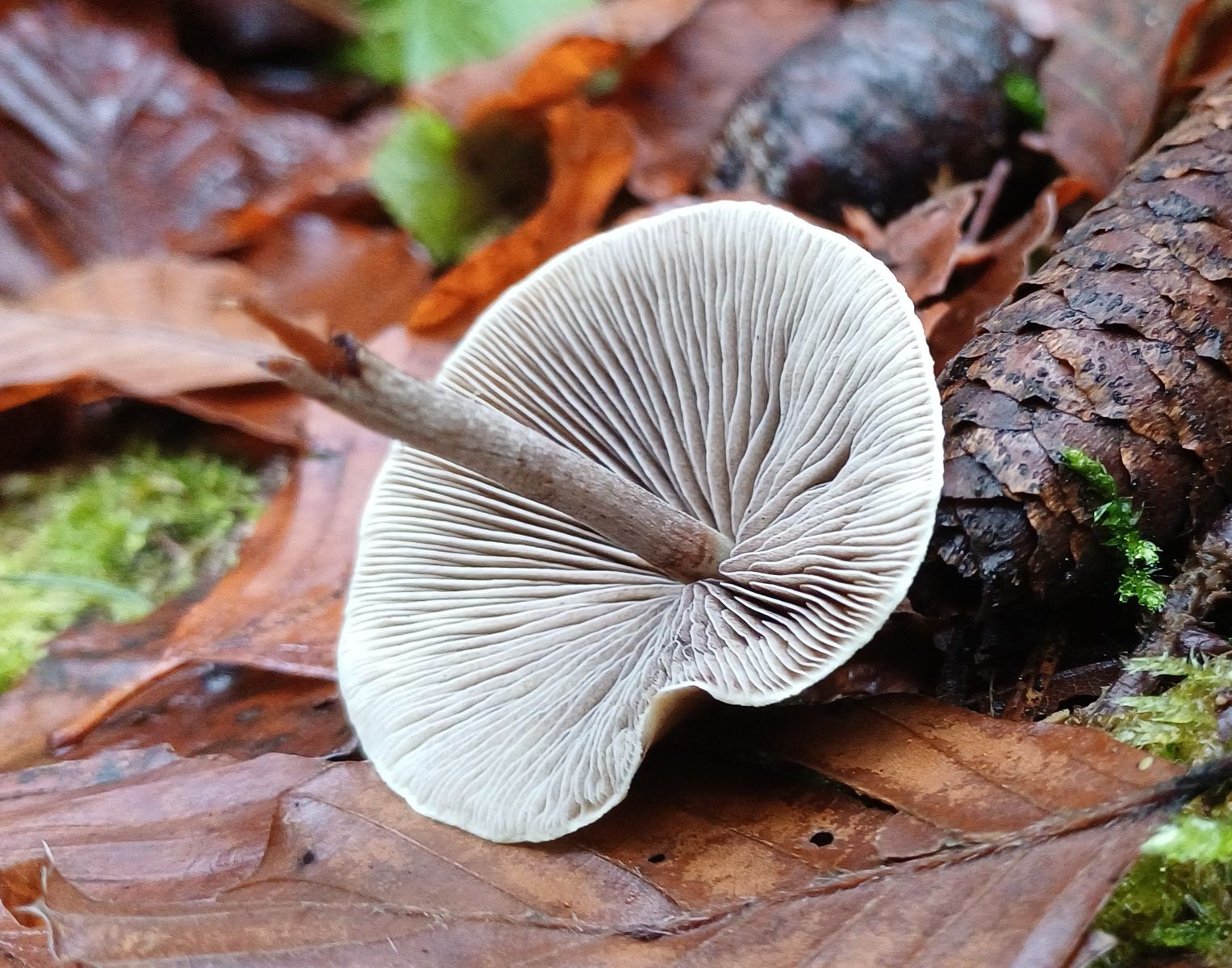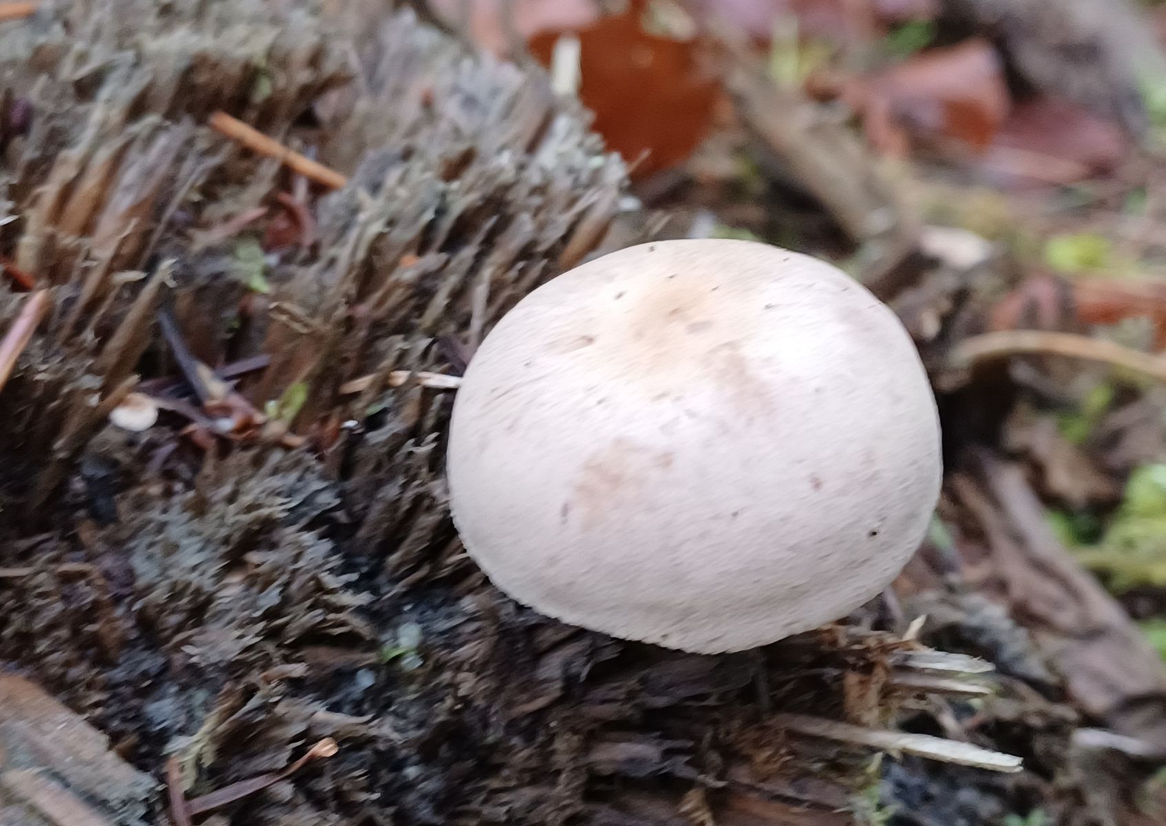 2. Dieser Pilz wuchs auf einem Baumstumpf (vermutl. Rotbuche). Kopf ist 3cm breit. Hut ist trocken und fühlt sich etwas klebrig an. Der Stiel ist derart zäh, dass ein Zerreißen mit den Fingern nicht möglich ist. Alles fühlt sich gummiartig an. Lamellen herablaufend, Geruch unauffällig (nicht mehlig). Sporenabwurf (bislang) misslungen.