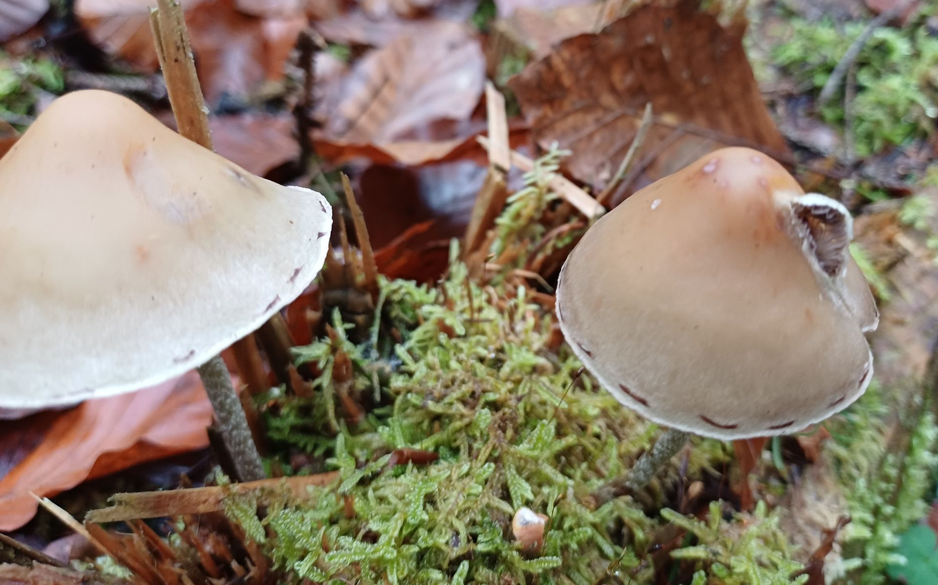 3. Auf Totholz (Buche?) zwei Pilze mit kegelförmigen Hut. Langer Stiel (8-10cm), Hut 5cm. Geruch erdig, leicht rettichartig. Hygrophan. Lamellen dunkles graubraun nach einem Tag. KI-Ergebnisse taugen nichts (Psilo, bzw. Mycena). Ich wäre da eher bei Psathyrella, evtl. conopilus wenn da Riefen im Hut wären.
