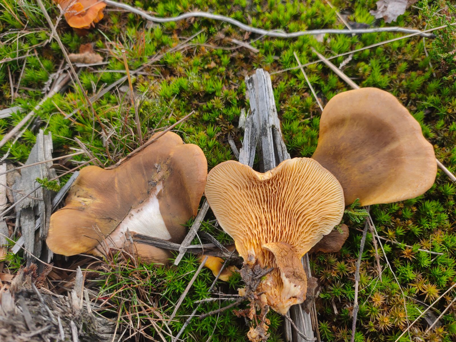 3. Hohenbuehelia Tapinella panuoides: Diese Zungenartigen FK ohne erkennbaren Stiel in gelbbrauner Fährbung waren an einem alte Baumstumpf mitten in der Sauerwiese zu finden.
