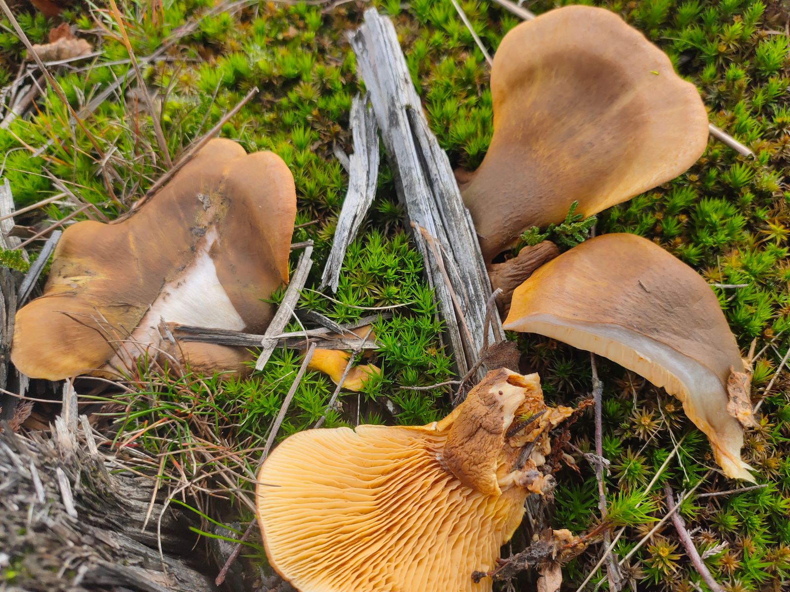 3. Hohenbuehelia Tapinella panuoides: Diese Zungenartigen FK ohne erkennbaren Stiel in gelbbrauner Fährbung waren an einem alte Baumstumpf mitten in der Sauerwiese zu finden.