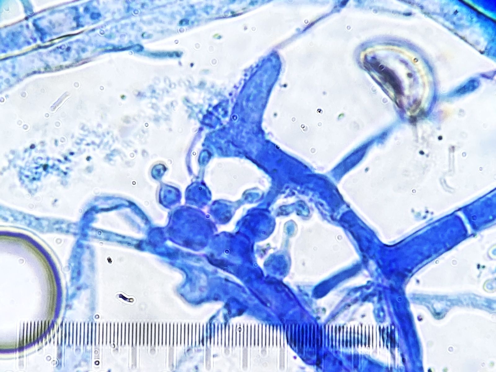 (Phyaliden + Konidien hyalin, daher färbbar mit Baumwollblau + Milchsäure)