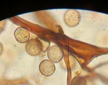 h) ich hatte den Eindruck, dass die Sporen eher einzeln sind und an einer Stelle habe ich auch eine einzelne Spore beobachten können, die noch am "Gerüst" hing (3. Mikrobild) > Spores free, sporangia dark (or pale) > j