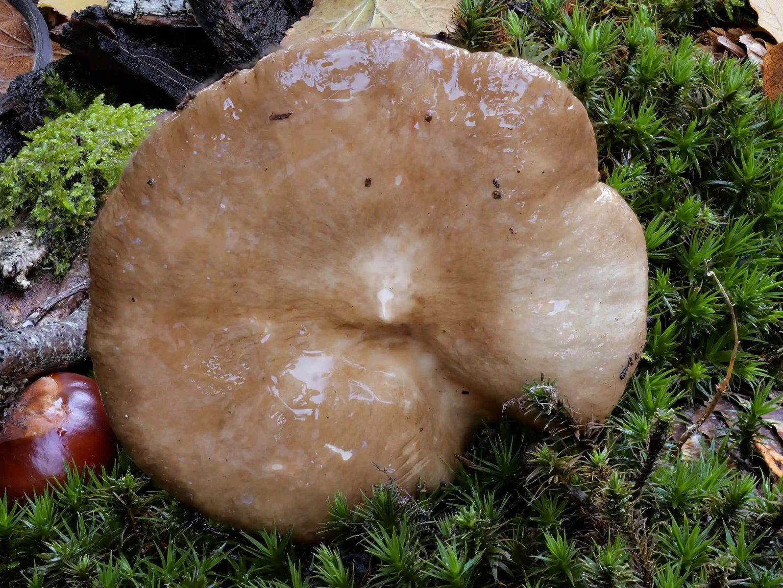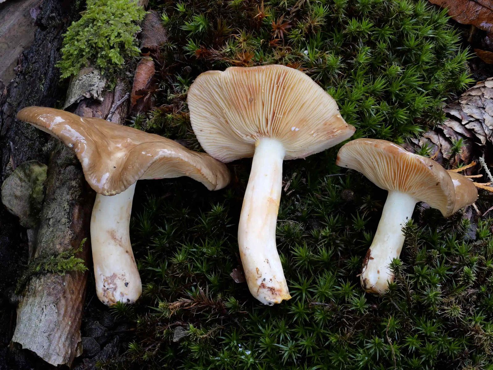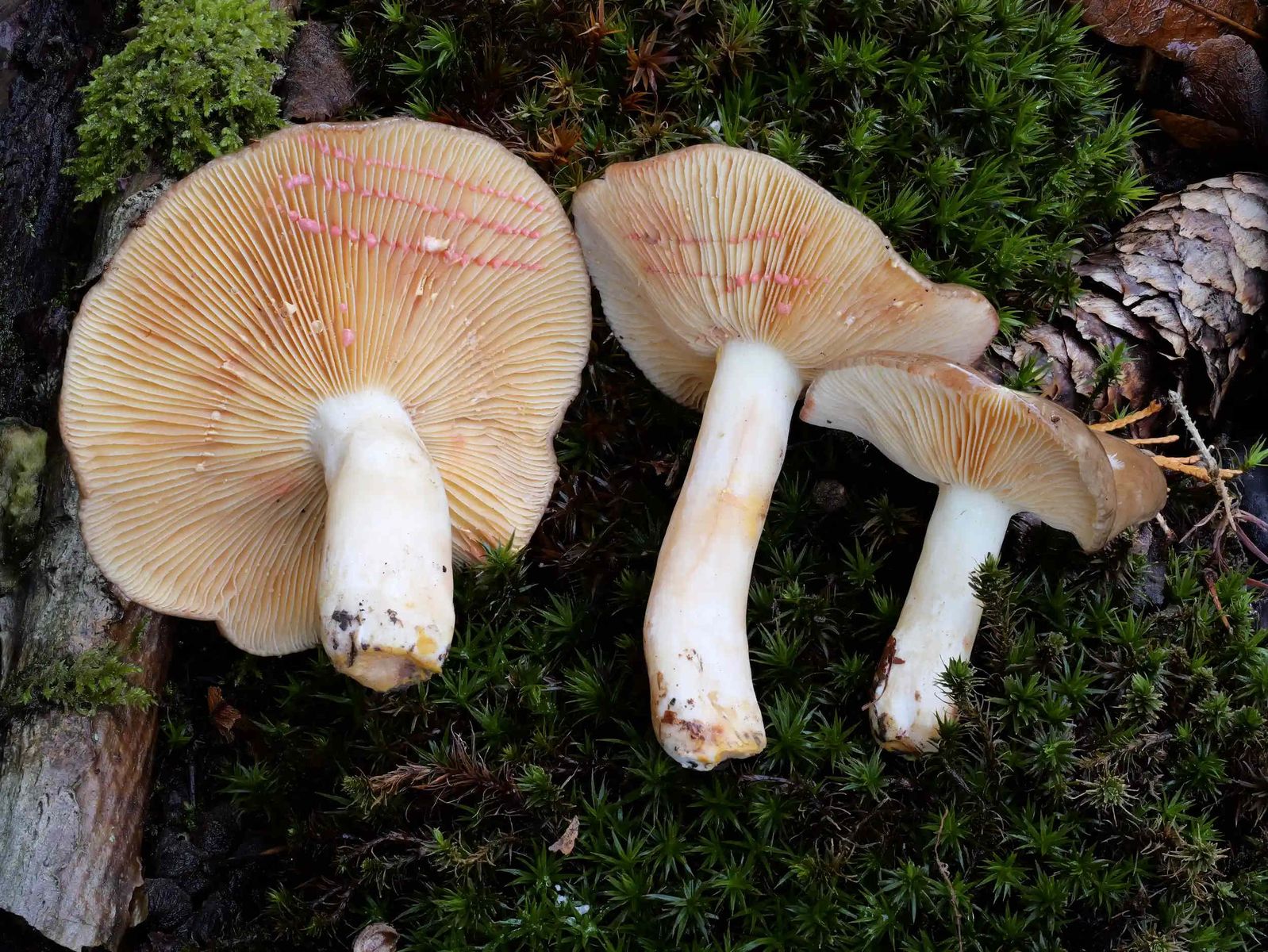 Ein weiterer bemerkenswerter Fund war einer der faszinierenden Korallen-Milchlinge: Lactarius acris, der Rosaanlaufende Milchling. Eindrucksvoll ist die Milch dieses Pilzes, die sich bereits wenige Sekunden nach dem Austritt an der Luft in ein leuchtendes Korallenrosa verfärbt. Ein entscheidendes Bestimmungsmerkmal dieser Art ist dabei, dass sich die Milch auch ganz ohne Berührung mit dem Fruchtfleisch verfärbt – im Gegensatz zu anderen Korallen-Milchlingen, bei denen die Milch nach dem Entfernen vom Fruchtfleisch ihre Farbe nicht ändert.