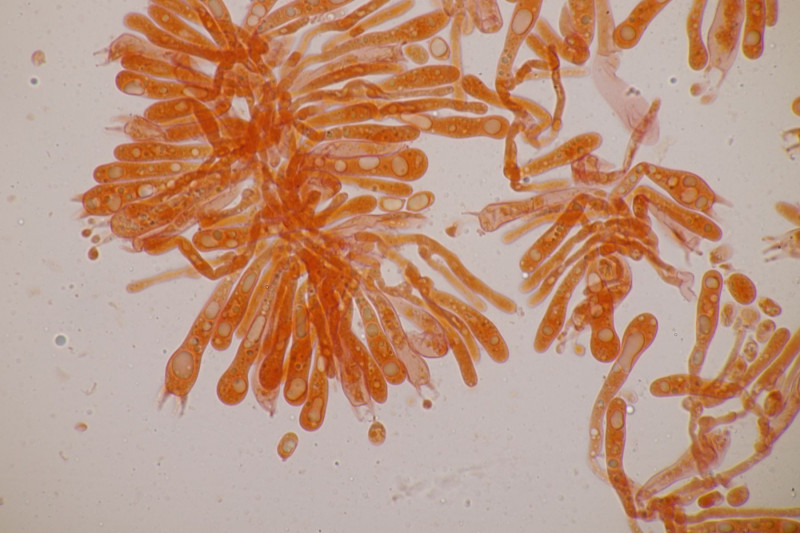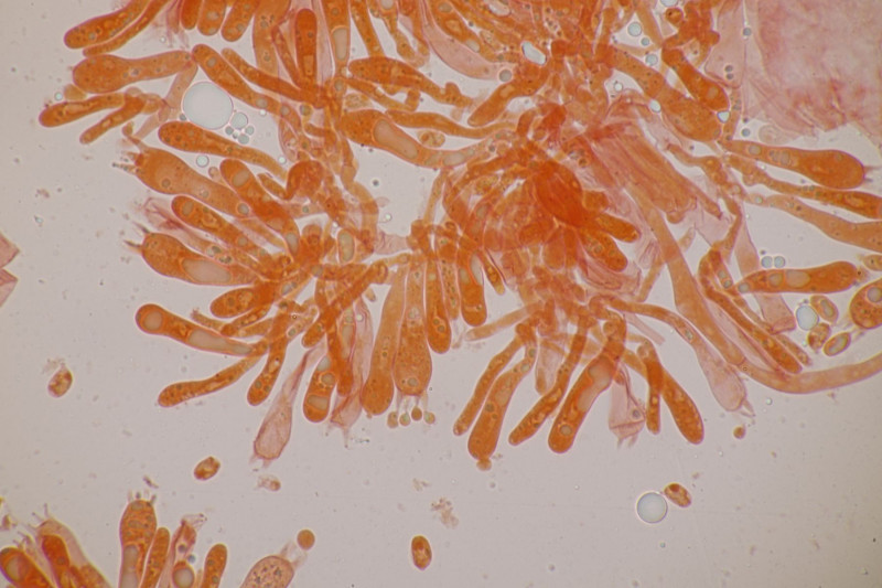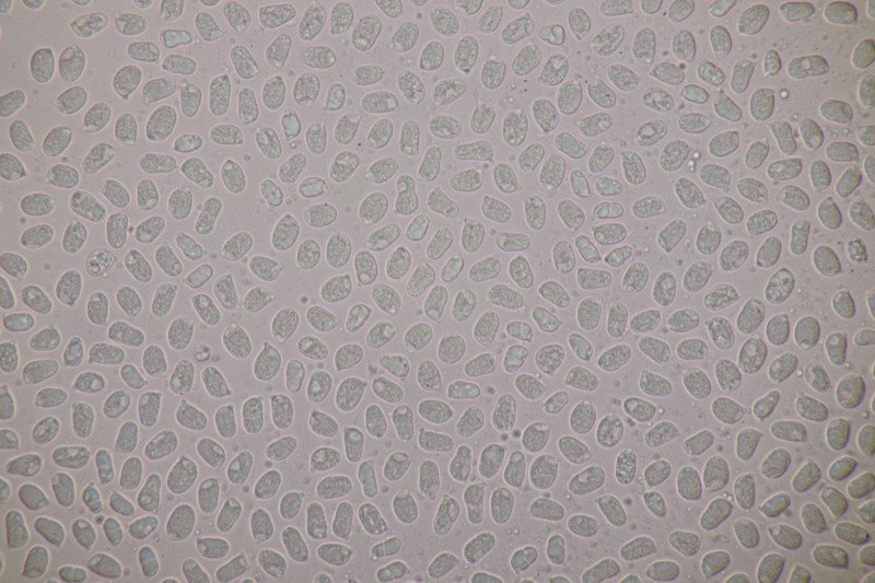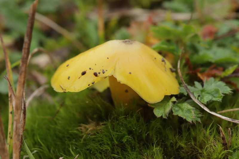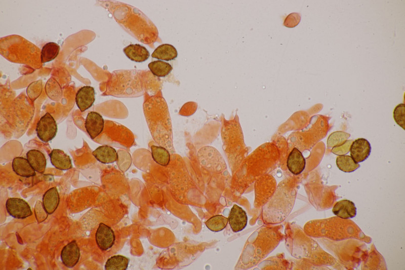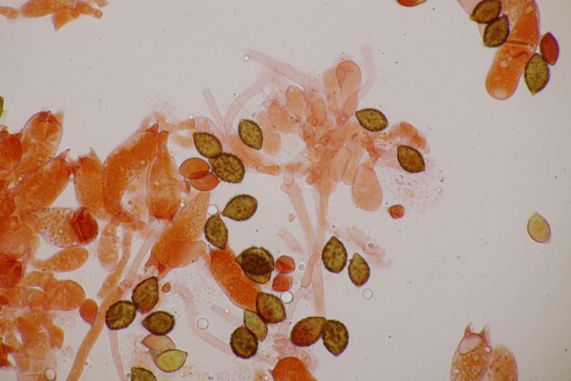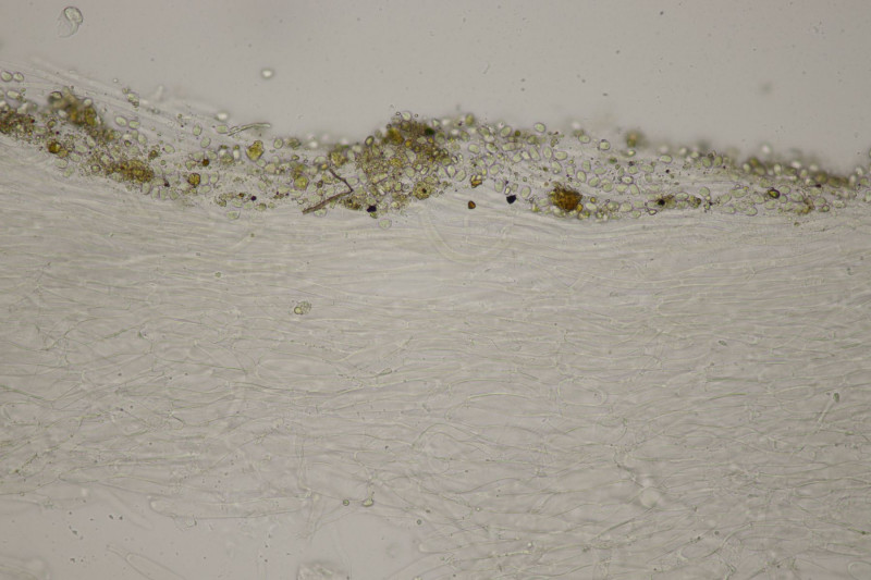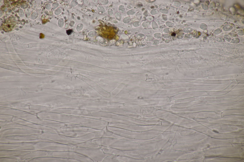 6. Ein Saftling, der zunächst mal an Hygrocybe fornicata erinnert. Die Sporen sind aber mit 8,6±0,6 µm × 5,3±0,4 µm, Q=1,6±0,2; 7,7-10,7 µm × 4,8-6,3 µm, Q=1,4-2,1 deutlich zu groß. Exsikkat ist vorhanden.