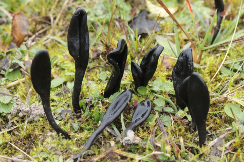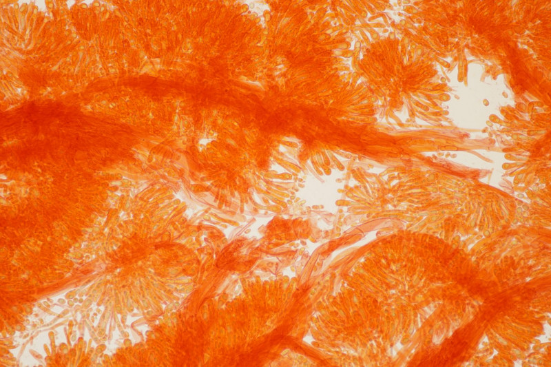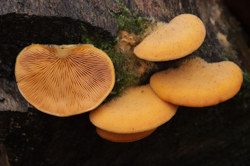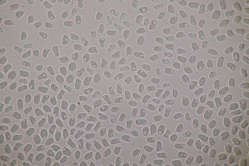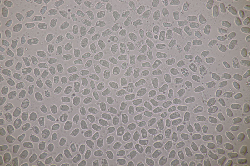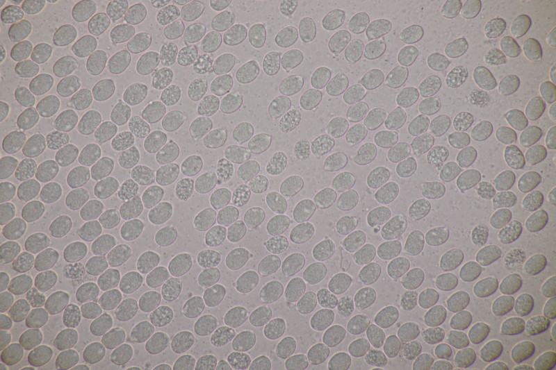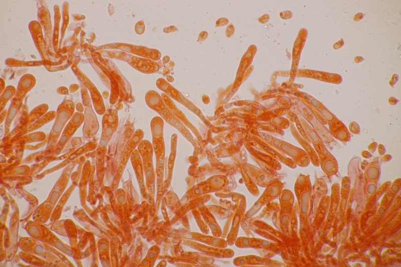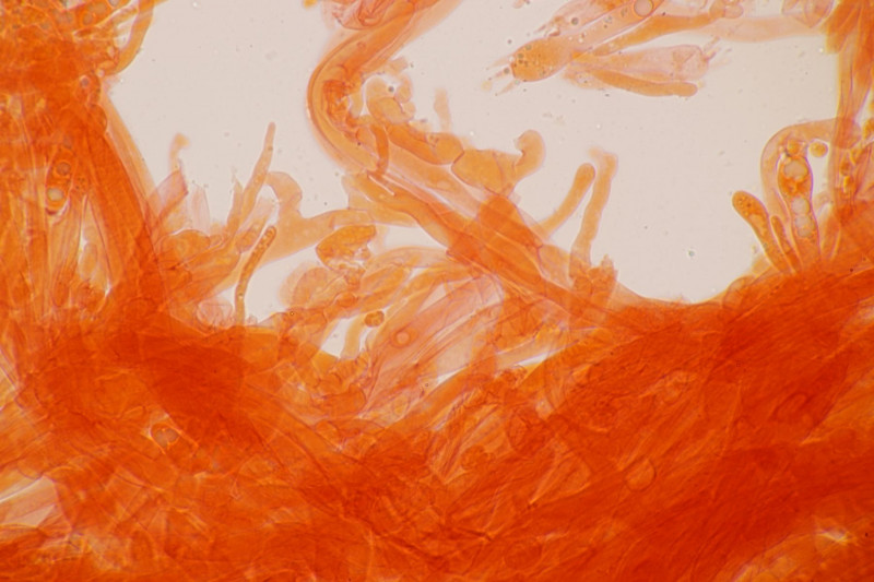 6. Ein Saftling, der zunächst mal an Hygrocybe fornicata erinnert. Die Sporen sind aber mit 8,6±0,6 µm × 5,3±0,4 µm, Q=1,6±0,2; 7,7-10,7 µm × 4,8-6,3 µm, Q=1,4-2,1 deutlich zu groß. Exsikkat ist vorhanden.