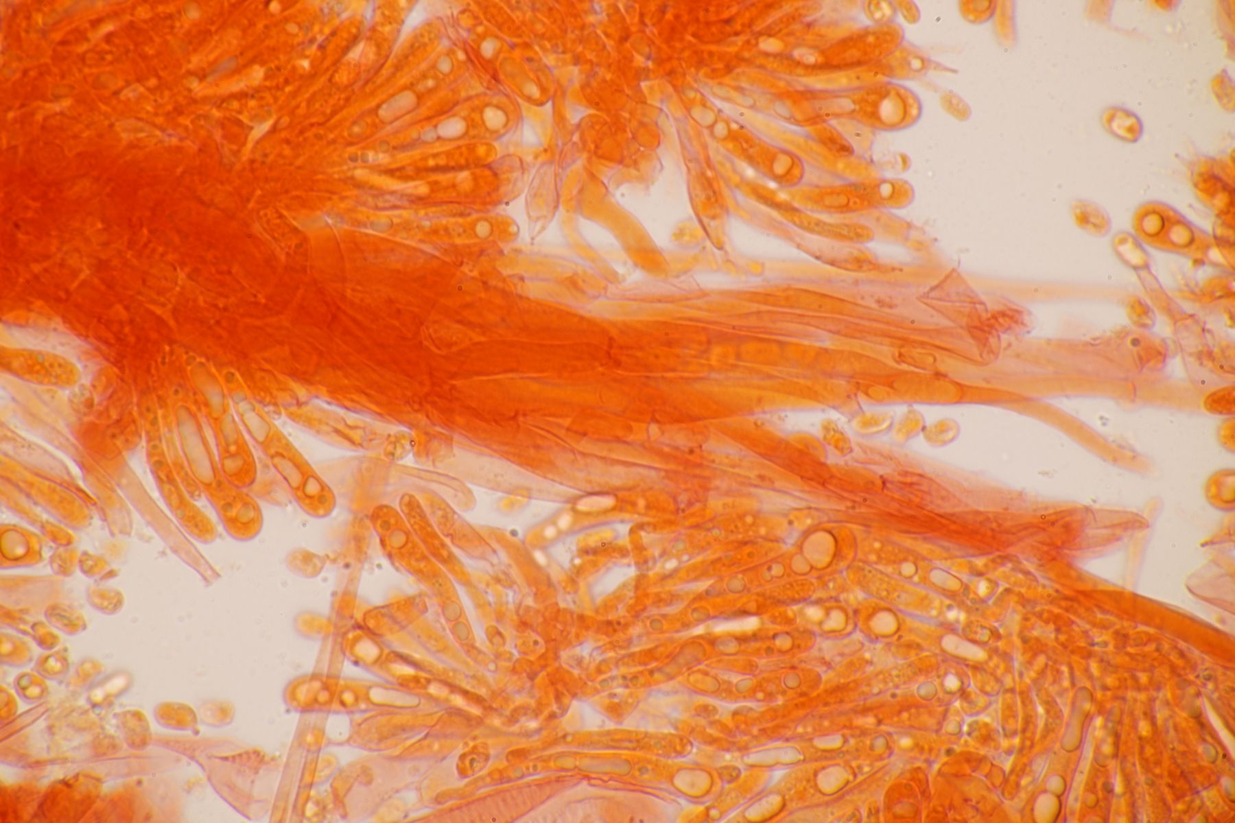6. Ein Saftling, der zunächst mal an Hygrocybe fornicata erinnert. Die Sporen sind aber mit 8,6±0,6 µm × 5,3±0,4 µm, Q=1,6±0,2; 7,7-10,7 µm × 4,8-6,3 µm, Q=1,4-2,1 deutlich zu groß. Exsikkat ist vorhanden.