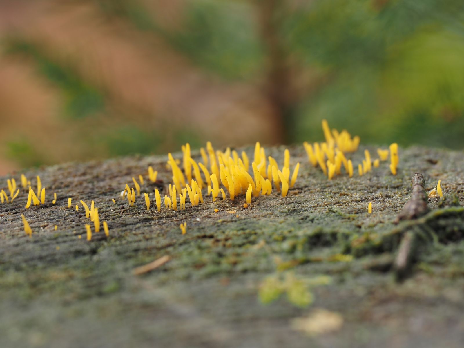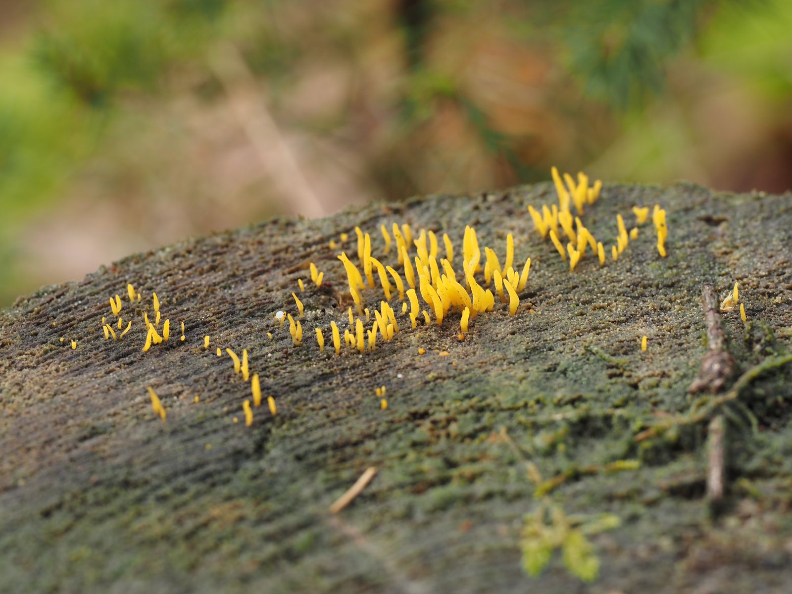 am 11.11.25, kurz vor 11 Uhr 11 fand ich in meinem Revier auf einem Baumstumpf einen kleinen gelben Pilz, den ich zuvor wohl noch nicht gesehen habe. Die FK sind etwa 1 cm lang und vielleicht 2 mm dick.