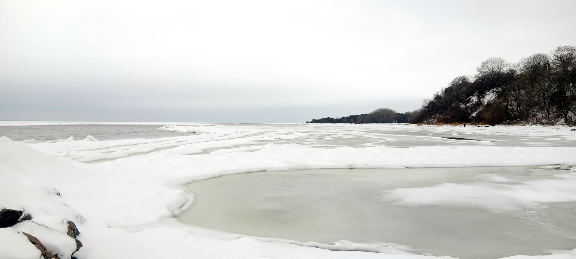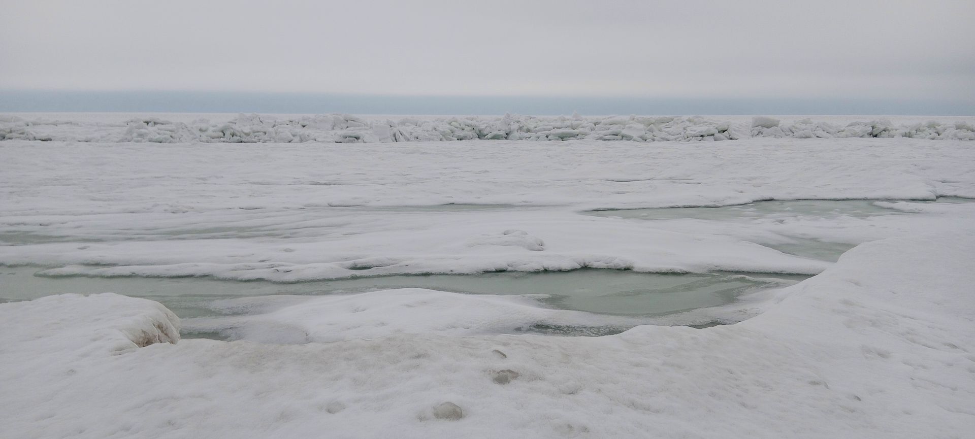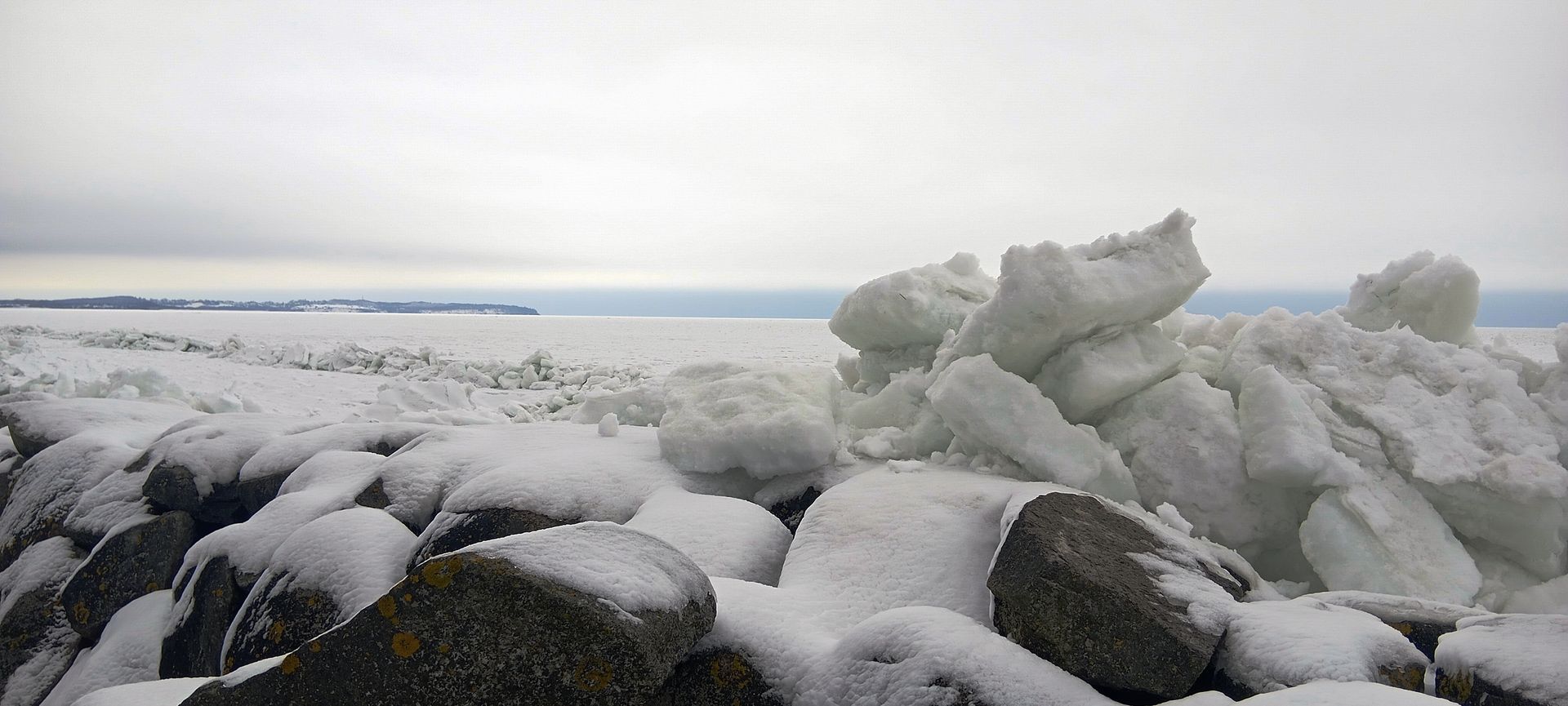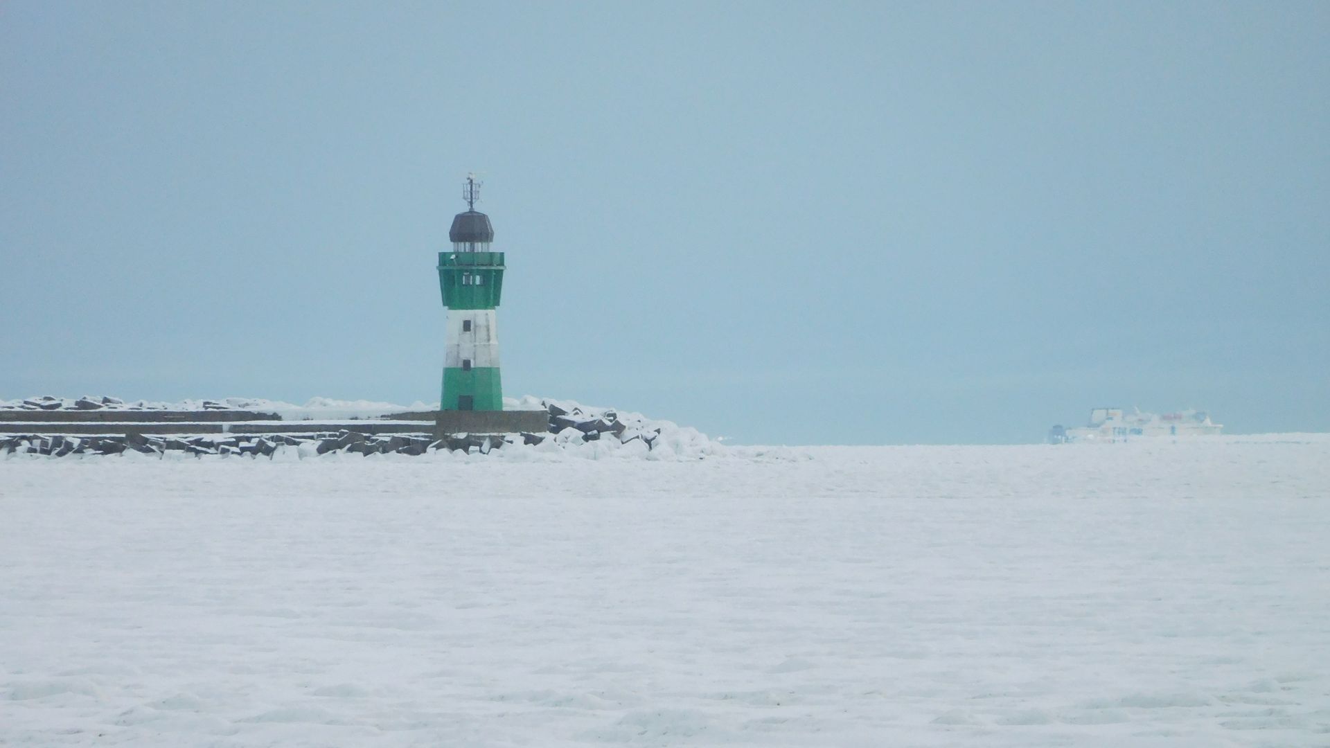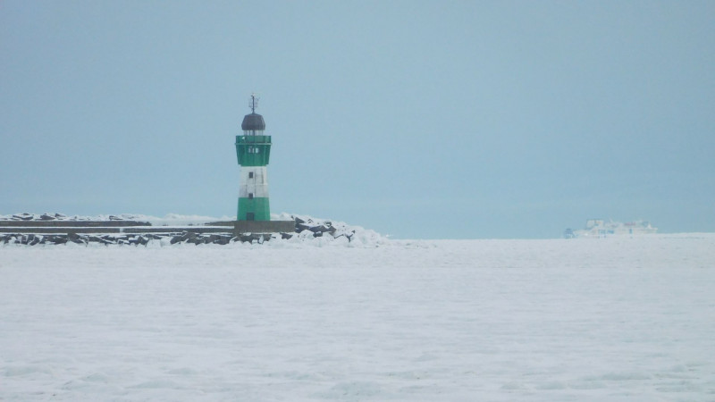 Seltsam, ein Fährschiff ist unterwegs. Dann ist das Eis weiter draußen wohl nicht so schlimm. (rechts im Bild)
