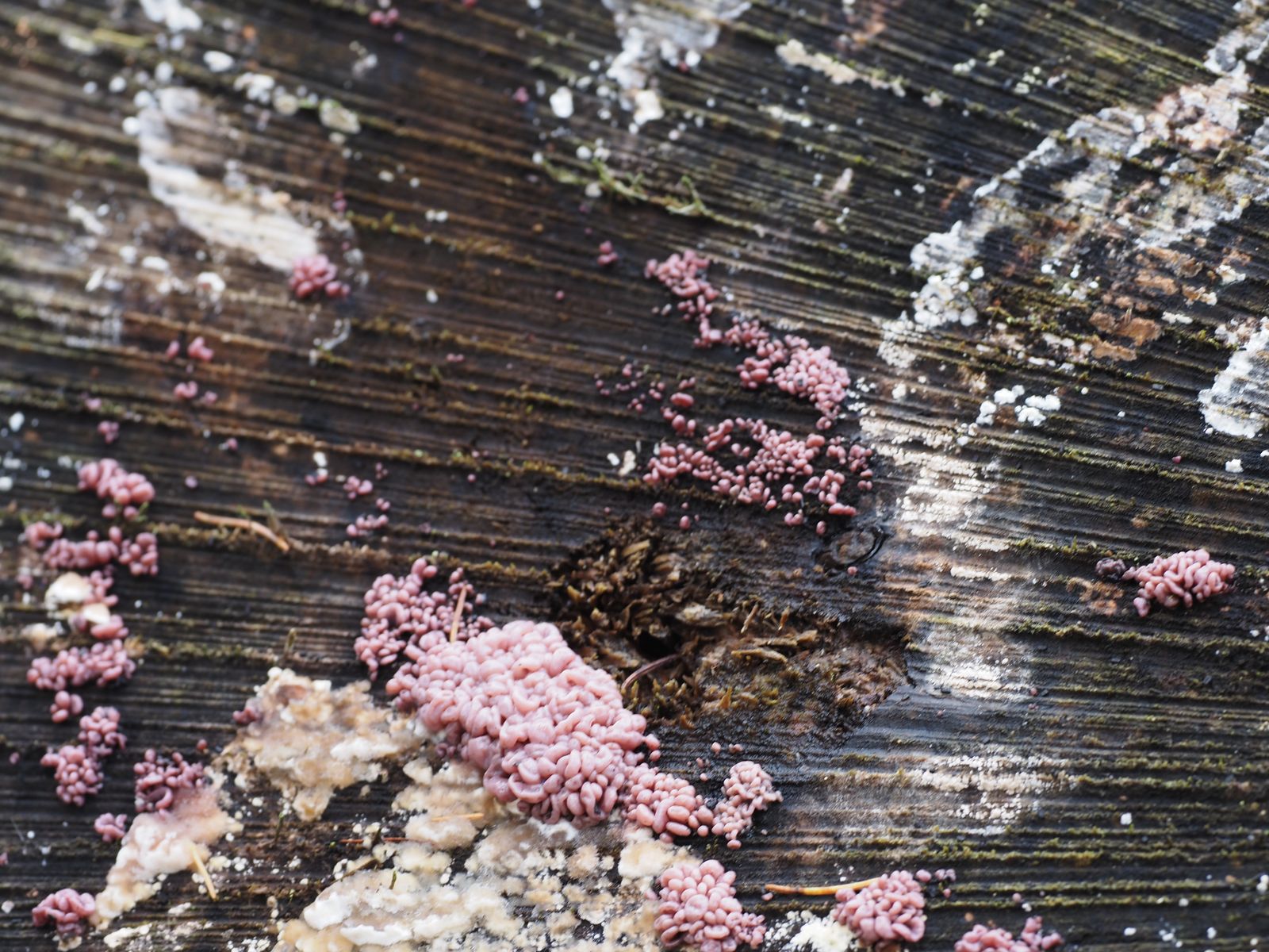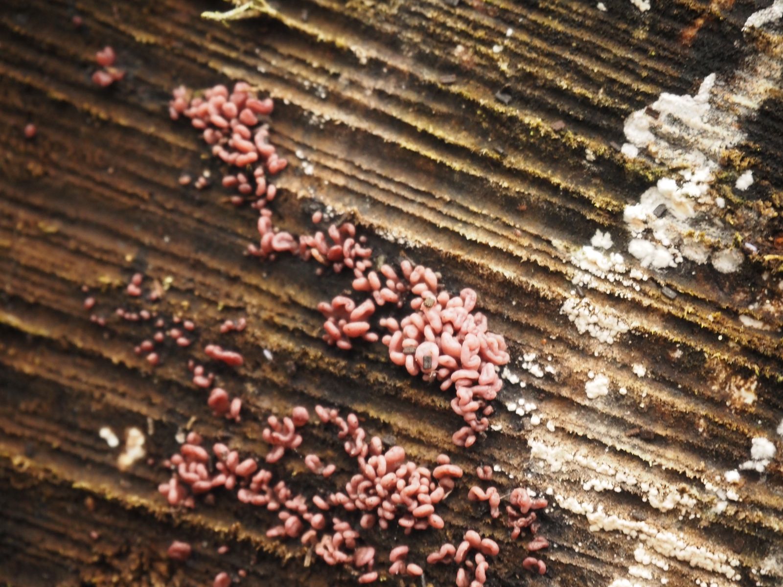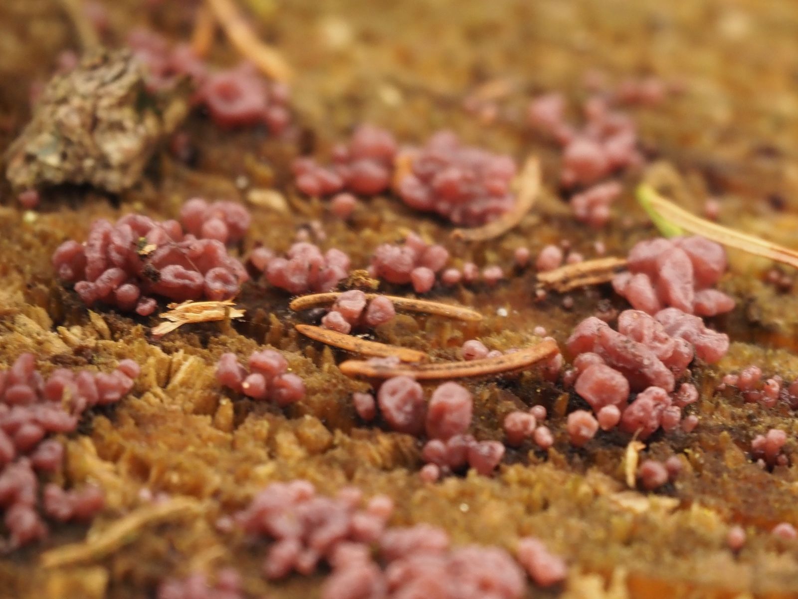 Der rosa-lila gefärbte Pilz sah auf den ersten Blick nach Kacke von irgendwelchen Lebewesen aus. Nur bei der Masse schien mir das unwahrscheinlich, so dass ich einen Pilz vermutete. Nachforschungen im Internet bei 123pilze.de und in meinen Pilzbüchern brachten mich dann zum Fleischroten Gallertbecher.