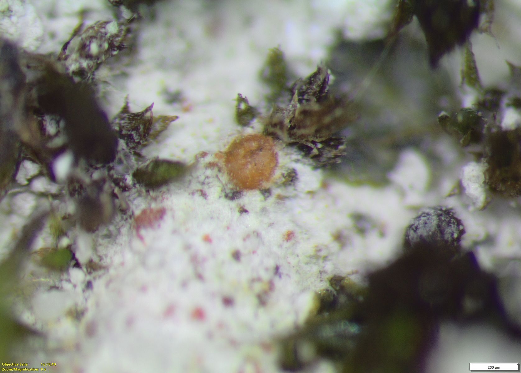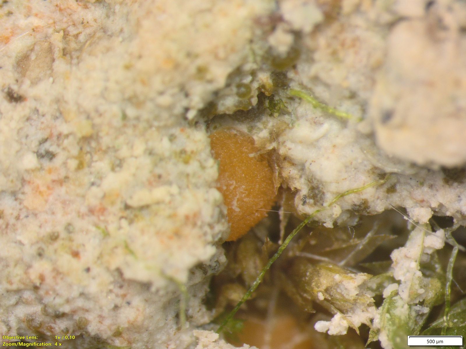 Der Fund stammt aus einem Kalksteinbruch (ca. 100m üNN, Niedersachsen) an periodisch überschwemmter Stellte. Zwischen (aber soweit ich sehen konnte nicht auf) Kleinmoosen wachsen flach aufsitzende bzw. in das Substrat eingesenkte gelbe Scheiben mit einem Durchmesser von bis zu 1mm.