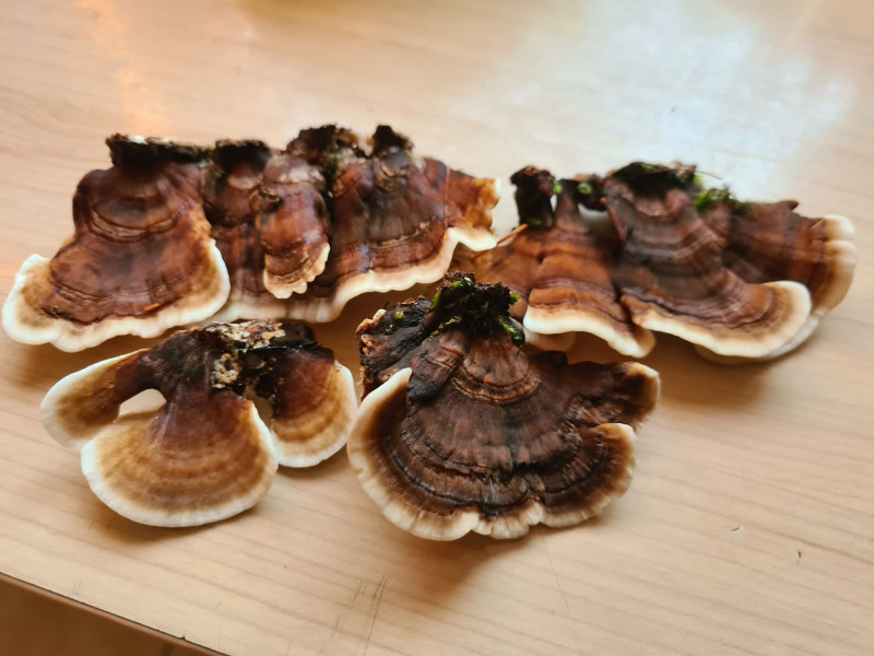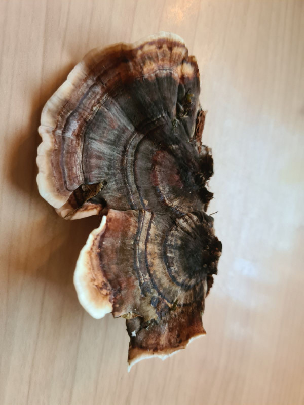 Generell sieht es für mich nach einer Schmetterlingstramete aus, aber es fehlen (abgesehen von 1-2 Pilzen), die dunkle, mehrfarbige, charakteristische Hutfarbe, die eben bei Schmetterlingstrameten blau/schwarz/grün/dunkel sein soll. Ebenso habe ich mehrere Exemplare auseinander geschnitten und konnte keine Cortex-Schicht sehen.