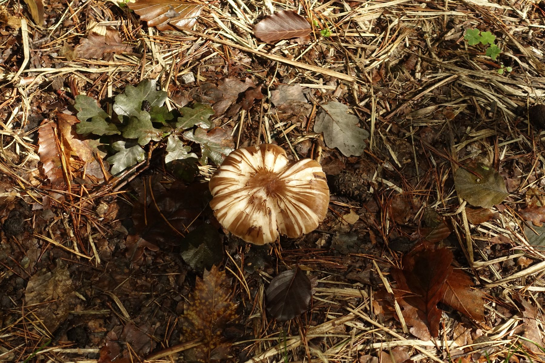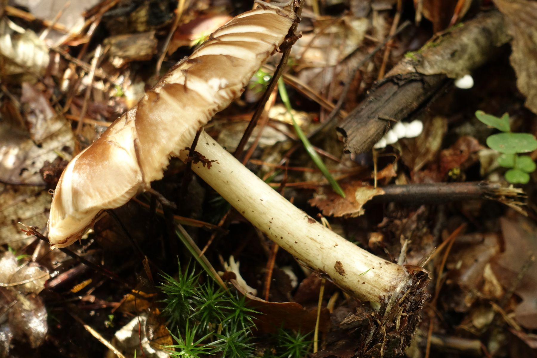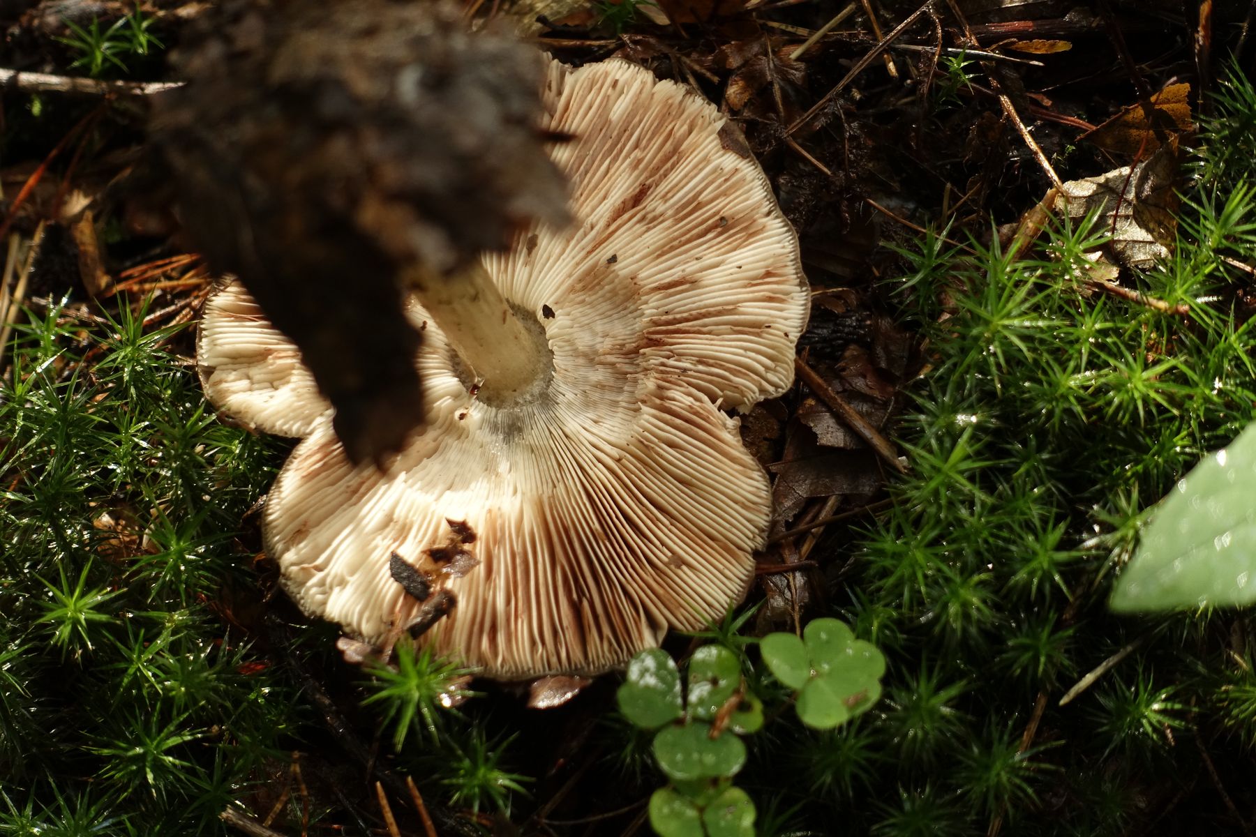 Bild 2: Blick unter den Hut in die frei stehenden Lamellen mit hellen Schneiden und m. E. braunem Sporenpulver