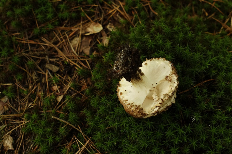 Bild 1: Der Pilz von oben mit spitzen braunen Velumresten auf dem hellen Hut