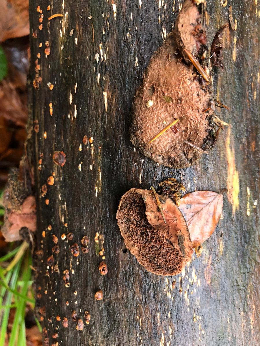 Buchentotholz, leider auf dem Bild nicht erkennbar aber die Unterseite ist cremeweiß und hat sehr feine unregelmäßig aber größtenteils rundliche Poren. Pilziger Geruch, vielleicht leicht süßlich.