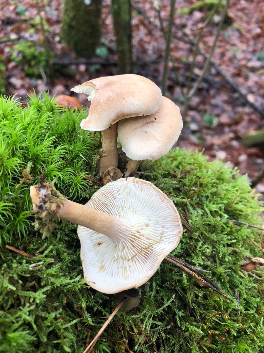 Wuchs am Fuße einer Eiche, umliegend kleine Buchen und weiter weg eine Kiefer. Da es nur ein Fruchtkörper gab habe ich diesen mehrfach fotografiert. Habe kein speziellen Geruch feststellen können. Hat eine kleine Hutspitze die auf den Bildern nicht so rüberkommt. Lamellen sind dünn & weich und laufen nicht am Stiel herab. Stielspitze weiß überhaucht. Wuchs nicht an Holz (alle anderen Pilze von diesem post sind ja an Holz)