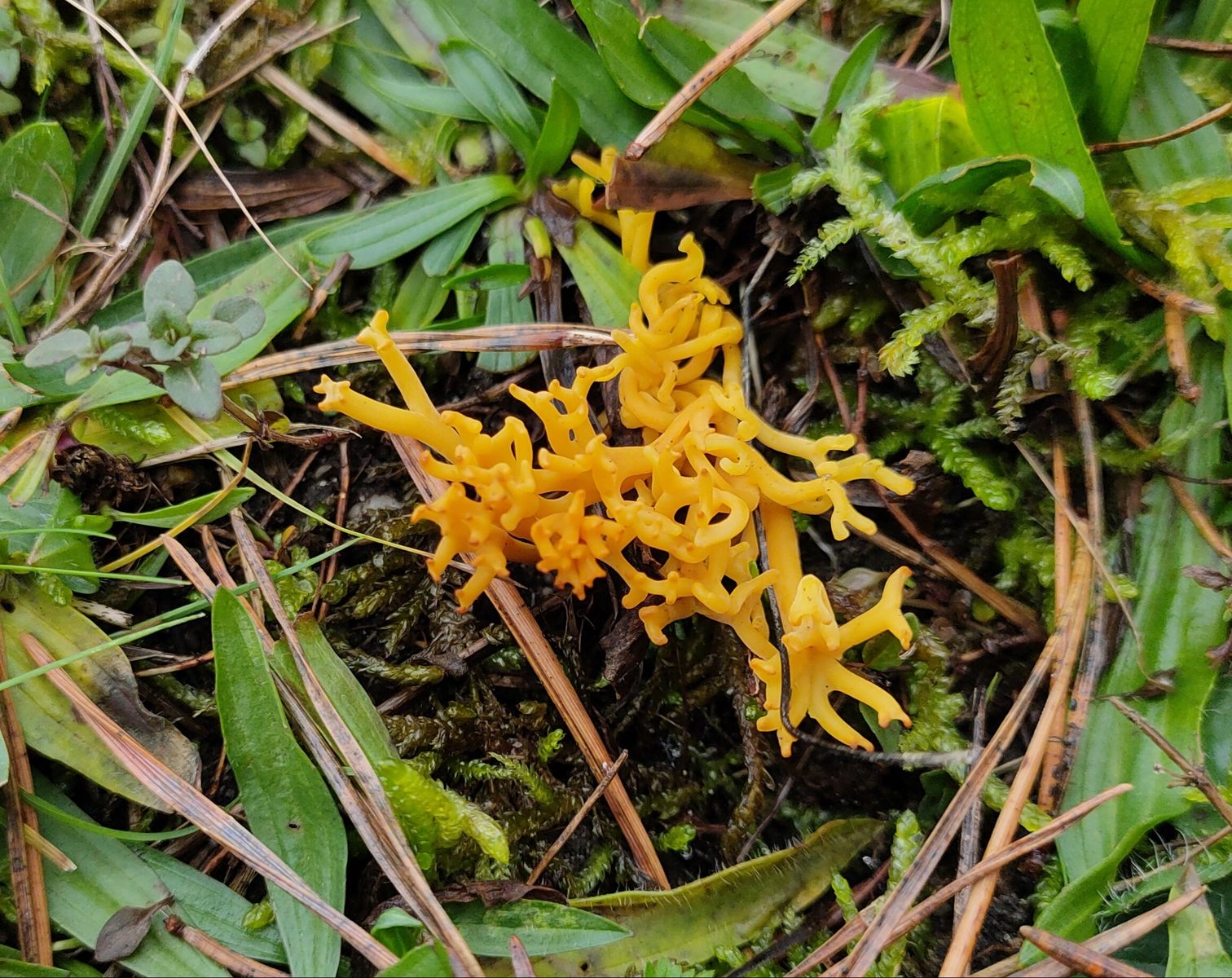 2. Clavaria/Clavulinopsis: Noch eine gelbe Unbekannte Keule die Büschelartig wächst und rote Spitzen zeigt und wurmartig verdreht ist.