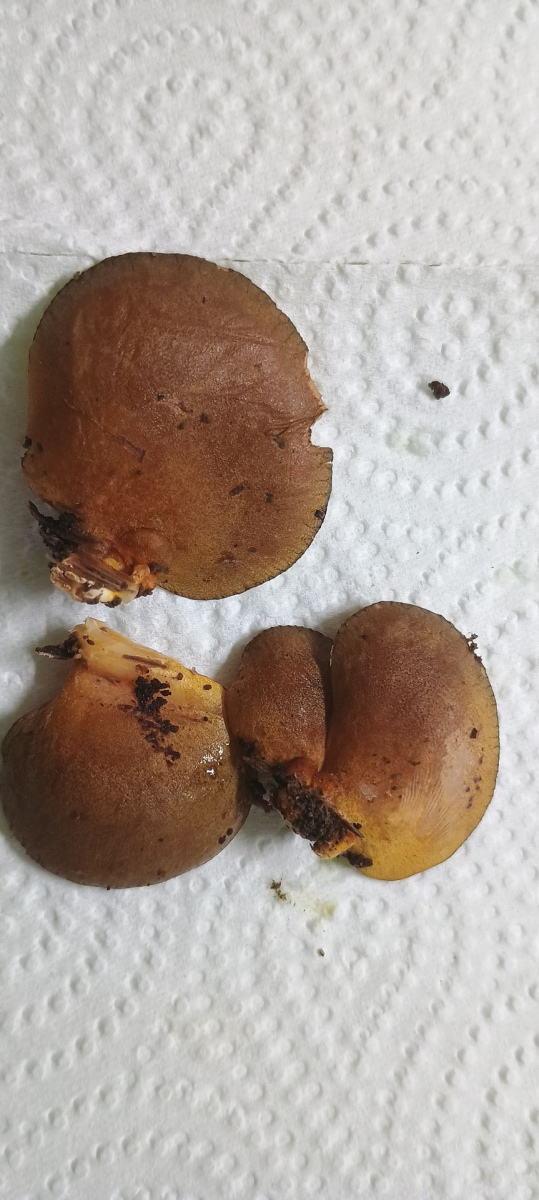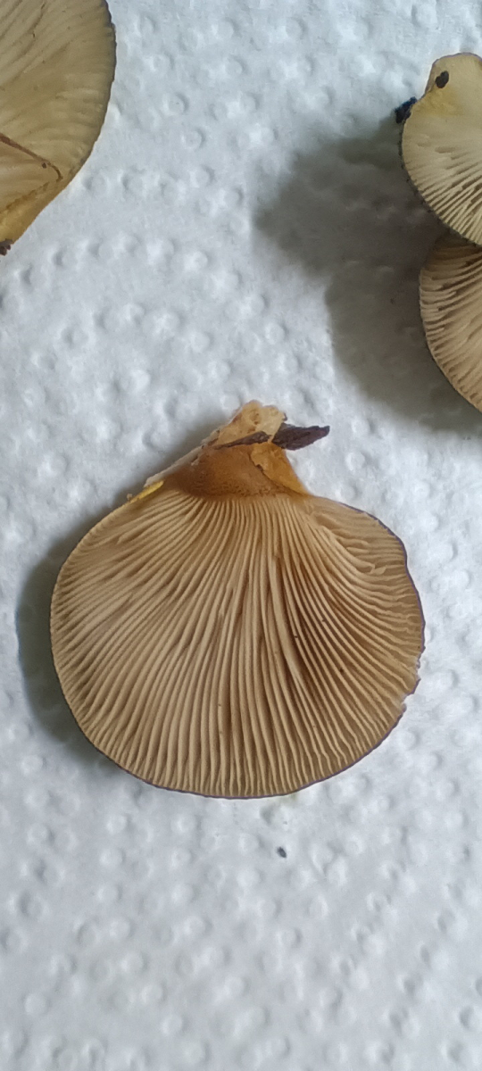 Hut: Muschelartig, gelb-braun; leicht grünlich