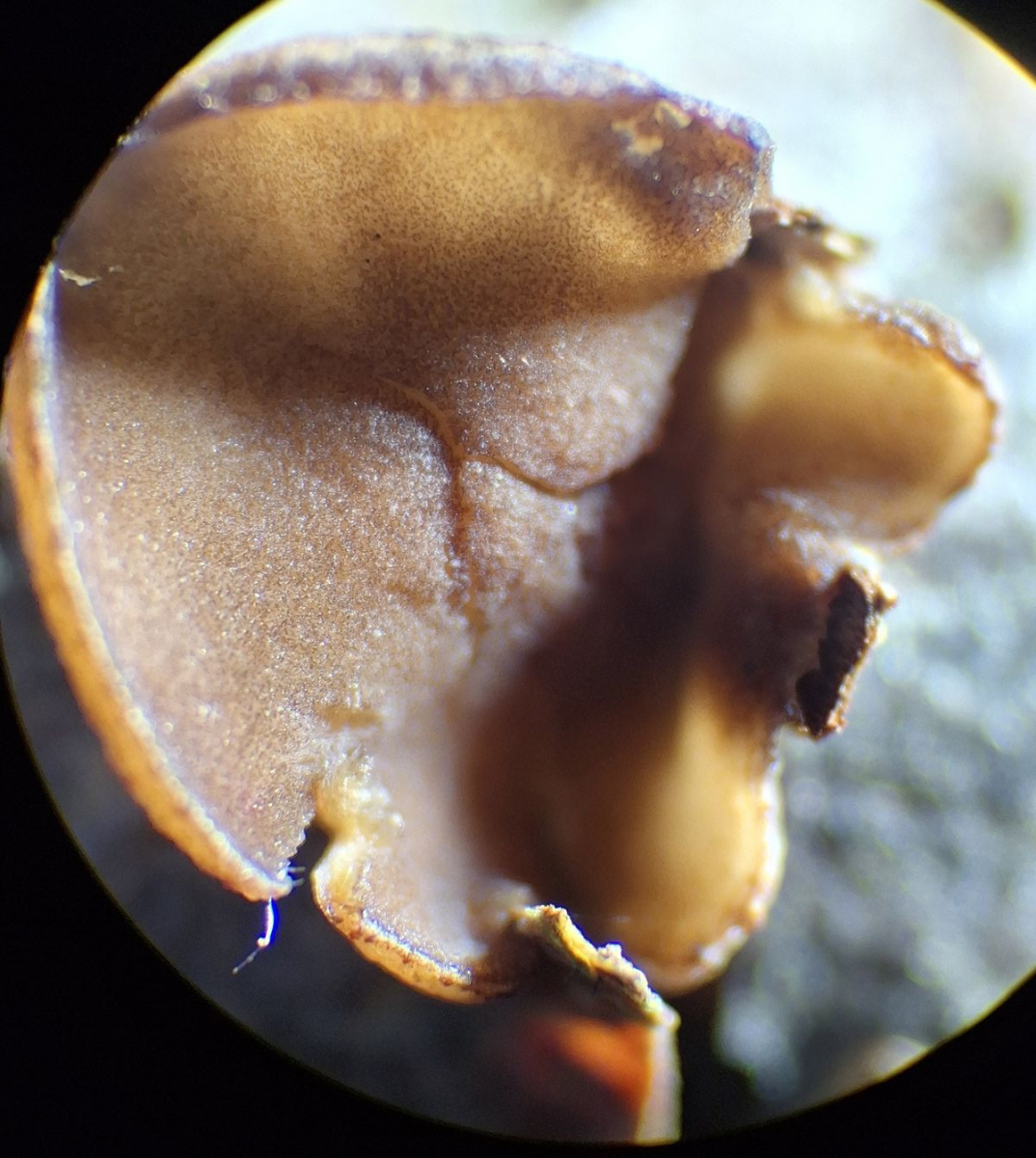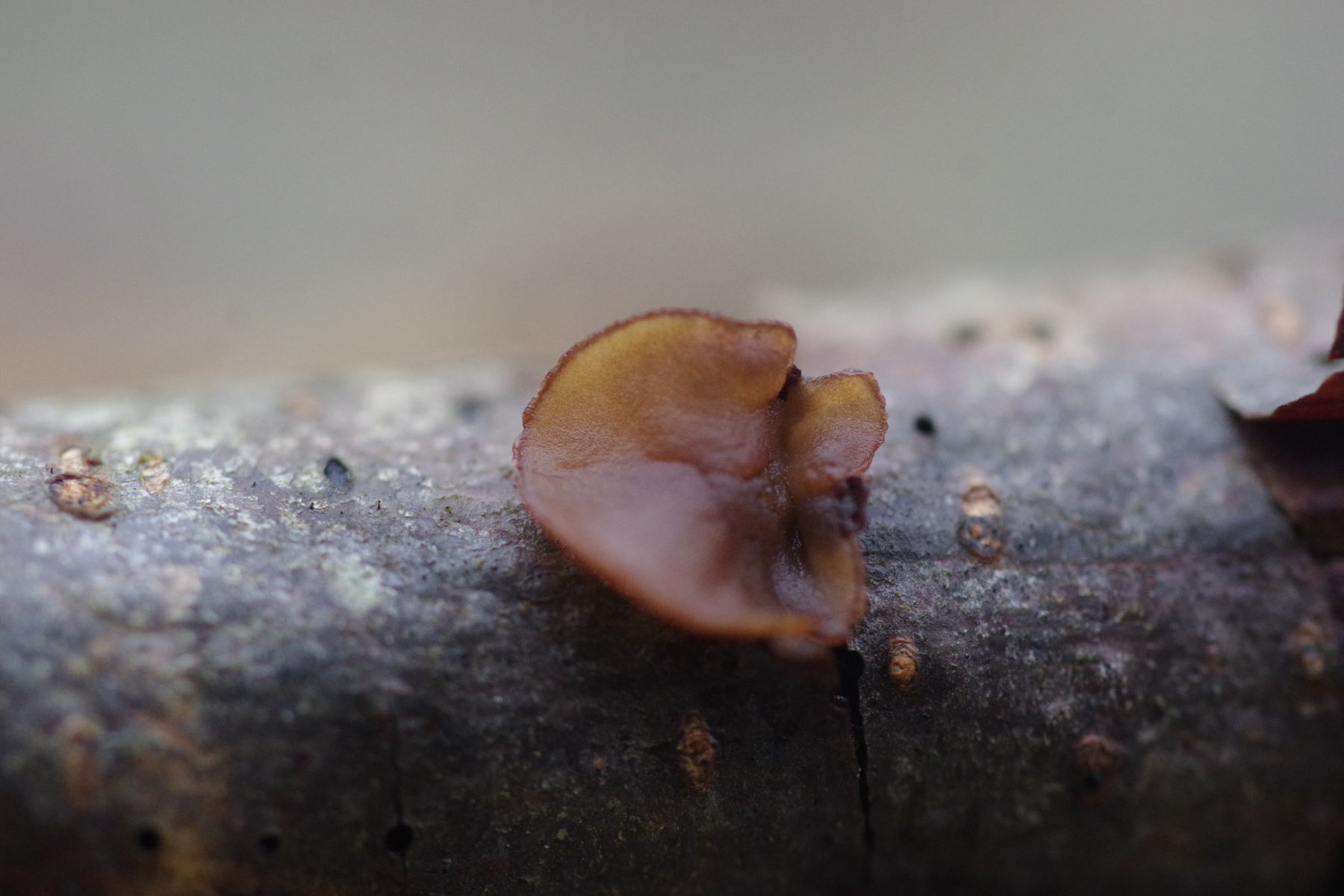 auf einem heruntergefallenen, noch teils berindeten Grauerlenast fiel mir heute ein relativ großer (~6 mm) brauner Becher auf.