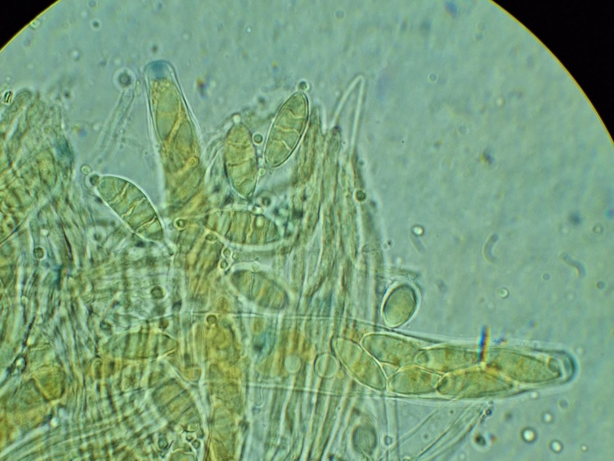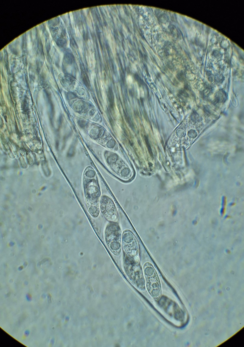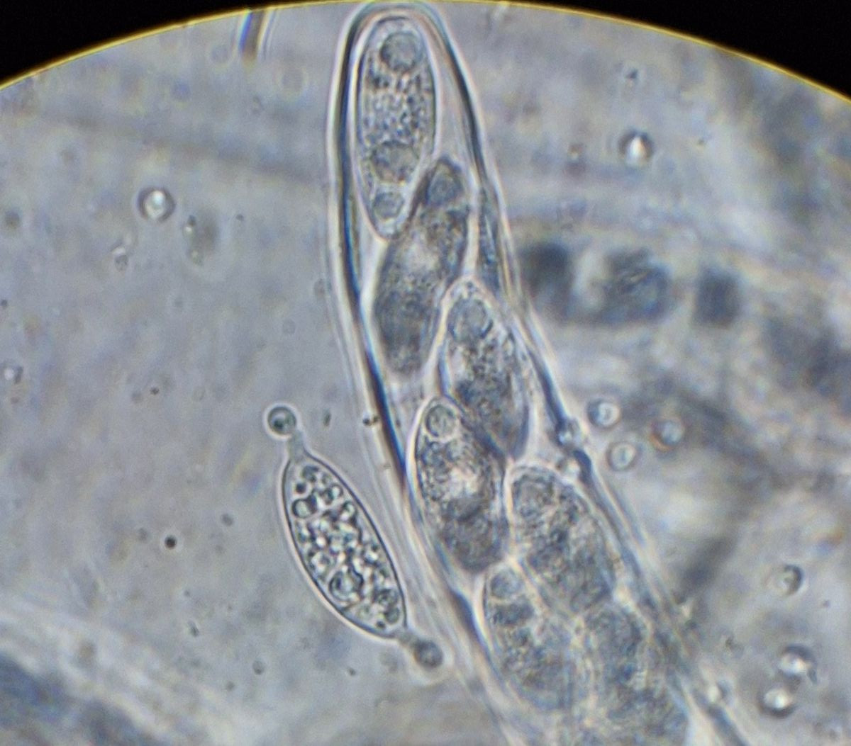 In Wasser, Asci so 170-210 µm lang, Sporen halbwegs einreihig, 18-22 (26)*7-10 µm, mit Tropfen, freie Sporen oft mit je einer Kuller an den Enden, dann über alles bis 30 µm lang. Daneben noch kleine Dinger, die evtl. als Konidien dazugehören könnten.