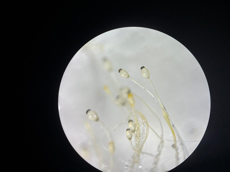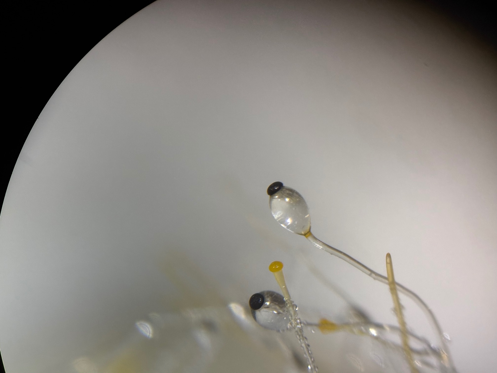 Auf Pferd wuchs jetzt diese hübsche Pilobolus-Art. Die kleinen Sporen ( ab 6,2 µm, kaum über 7 lang) führen mich zu P.roridus.