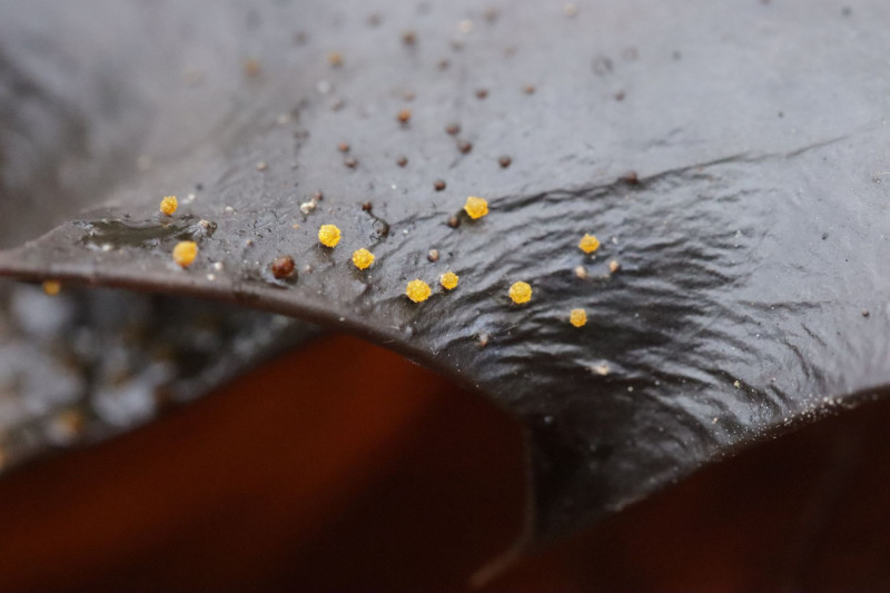 am letzten Samstag habe ich eine Runde im Duisburger Stadtwald gedreht und dabei in der Buchen-Laubstreu unter einem Strauch von Ilex aquifolium auf den abgestorbenen Ilex-Blättern einen hübschen Pyrenomyceten entdecken: Calonectria lauri. Der Pilz scheint relativ selten zu sein, es gibt bei pilze-deutschland.de aktuell nur 2 Fundmeldungen.