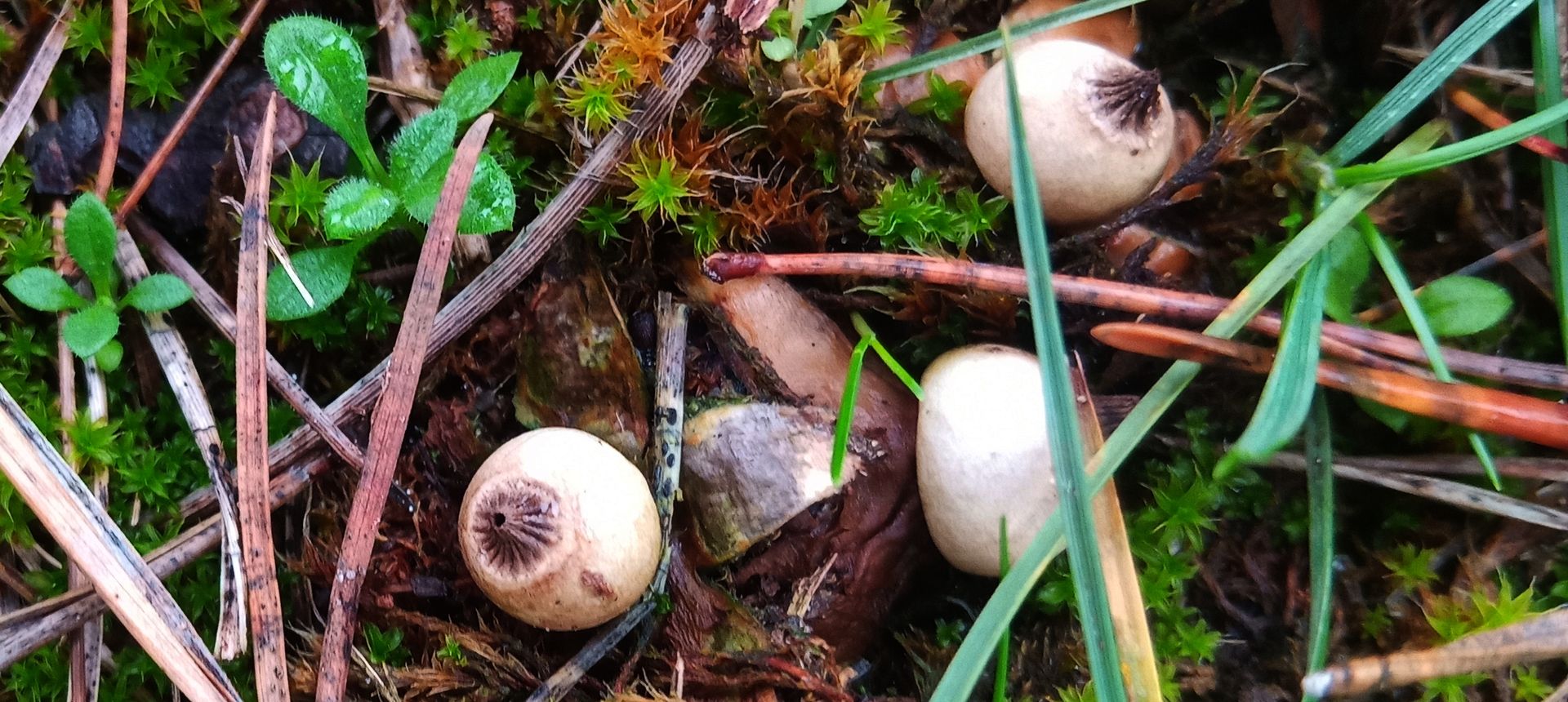 Bei einer Wanderung haben wir in den Dünen am Wegrand bei Kiefern diese winzigen Erdsterne gefunden. Die Sporenkugel war bei allen nur etwas größer als 5 mm, aber keinen cm groß.