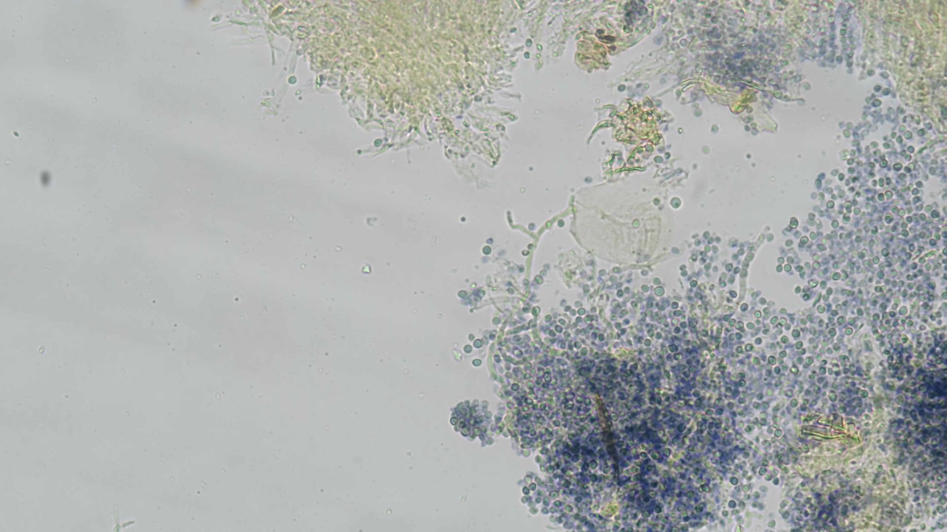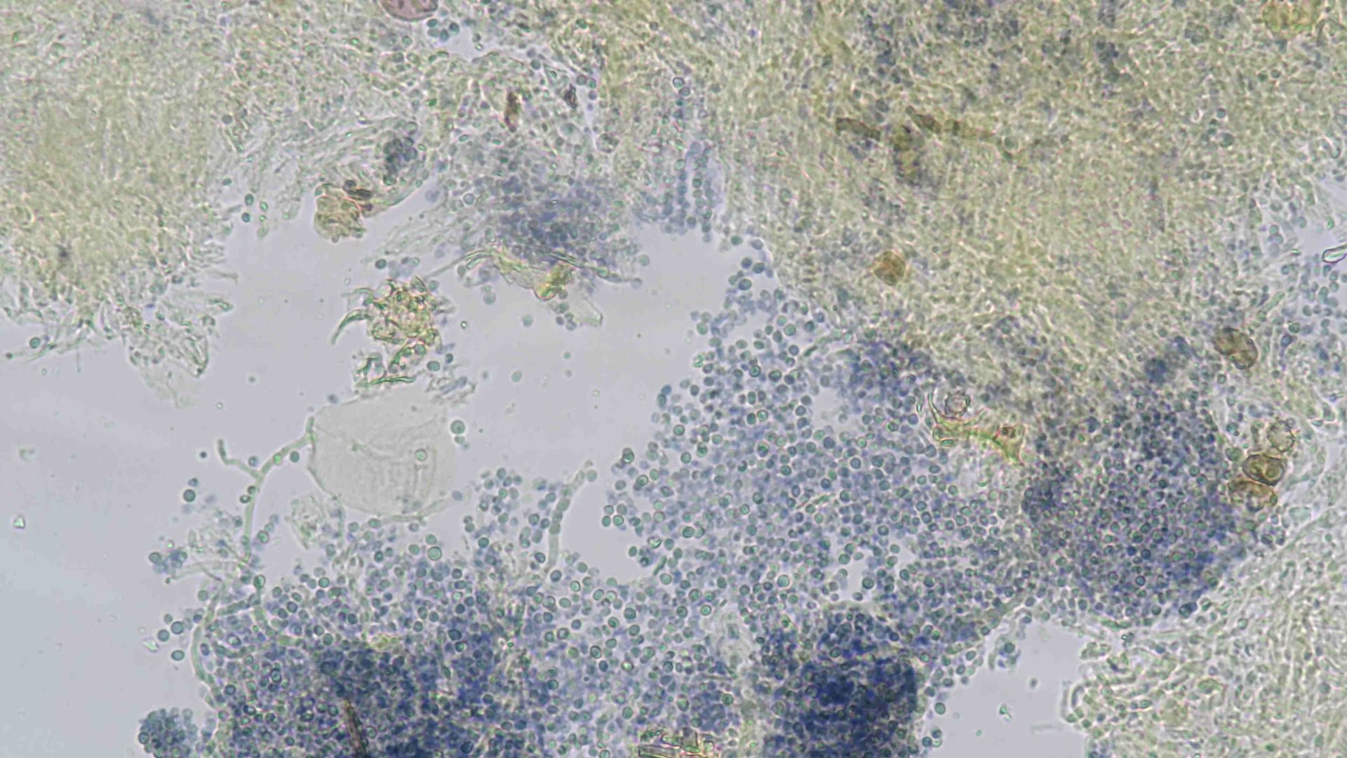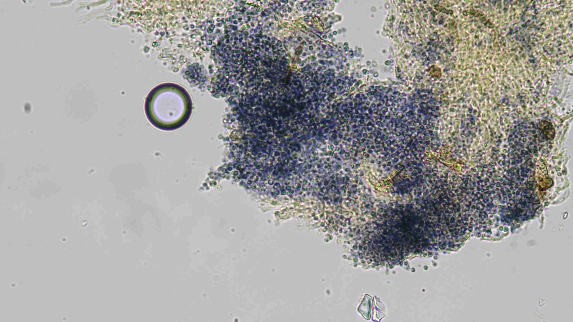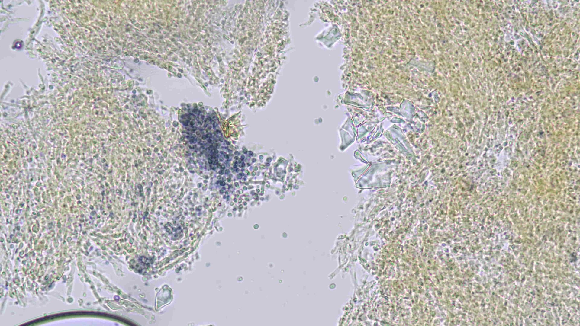 jetzt sieht man die Amyloidität sehr gut. Bei Einzelsporen im Mikroskop ist das oft schwerer zu burteilen, auf Fotos dann nochmal schwerer. Hier sieht man aber schön anhand der vielen Sporen, die übereinander liegen, dass sie sich deutlich blau verfärben. Bestimmung also bestätigt: Anomolomy myceliosum.